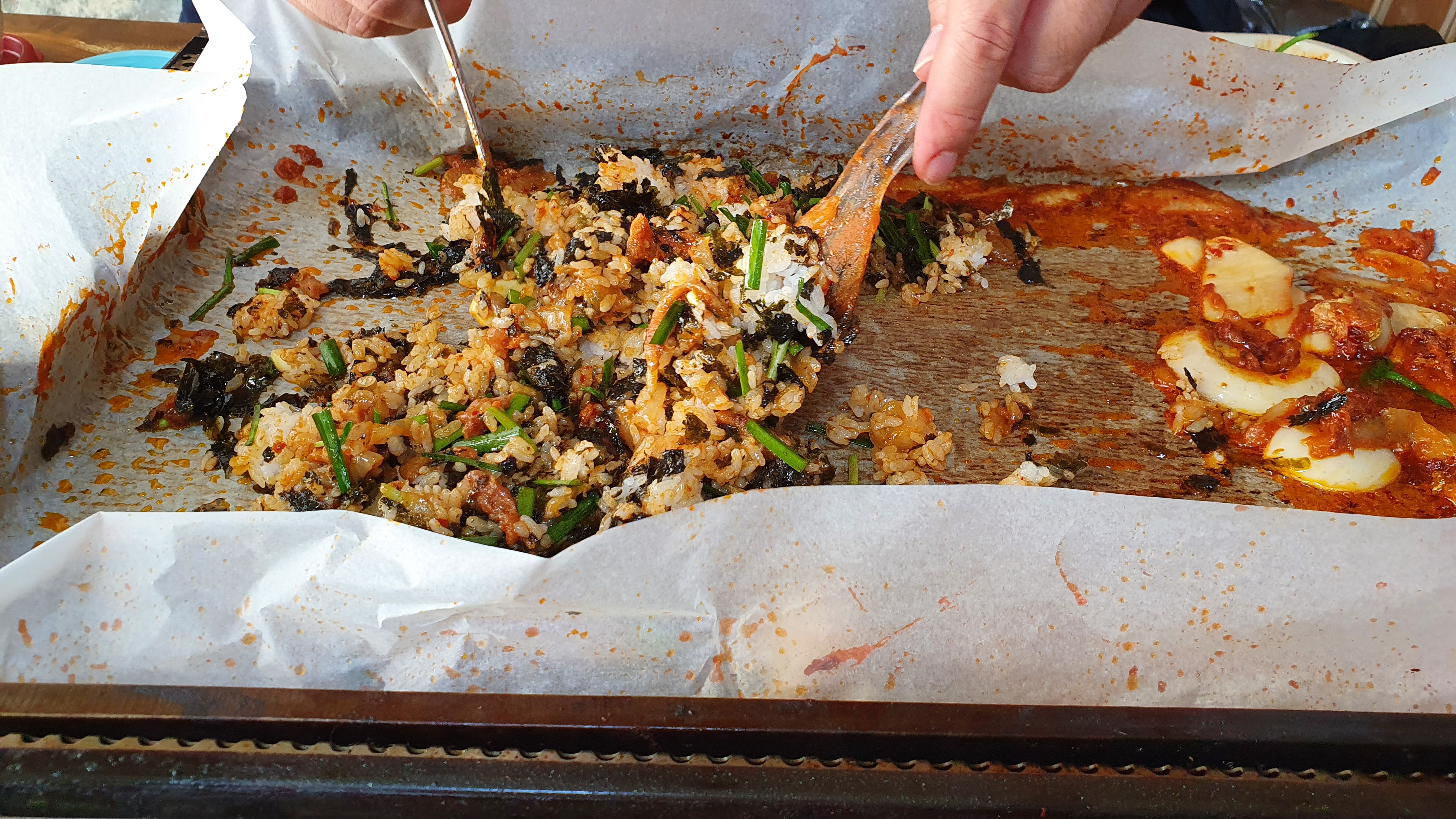 잘 볶아진 볶음밥을 한수저 먹어보았는데요. 역시 예상했던 볶음밥 최상의 맛이 납니다~! 하지만.. 한 가지 아쉽습니다. 저희 부부의 실수였는데요. 오리 먹을 때 김치를 좀 많이 남겨둘걸...이라는 생각을 했네요.