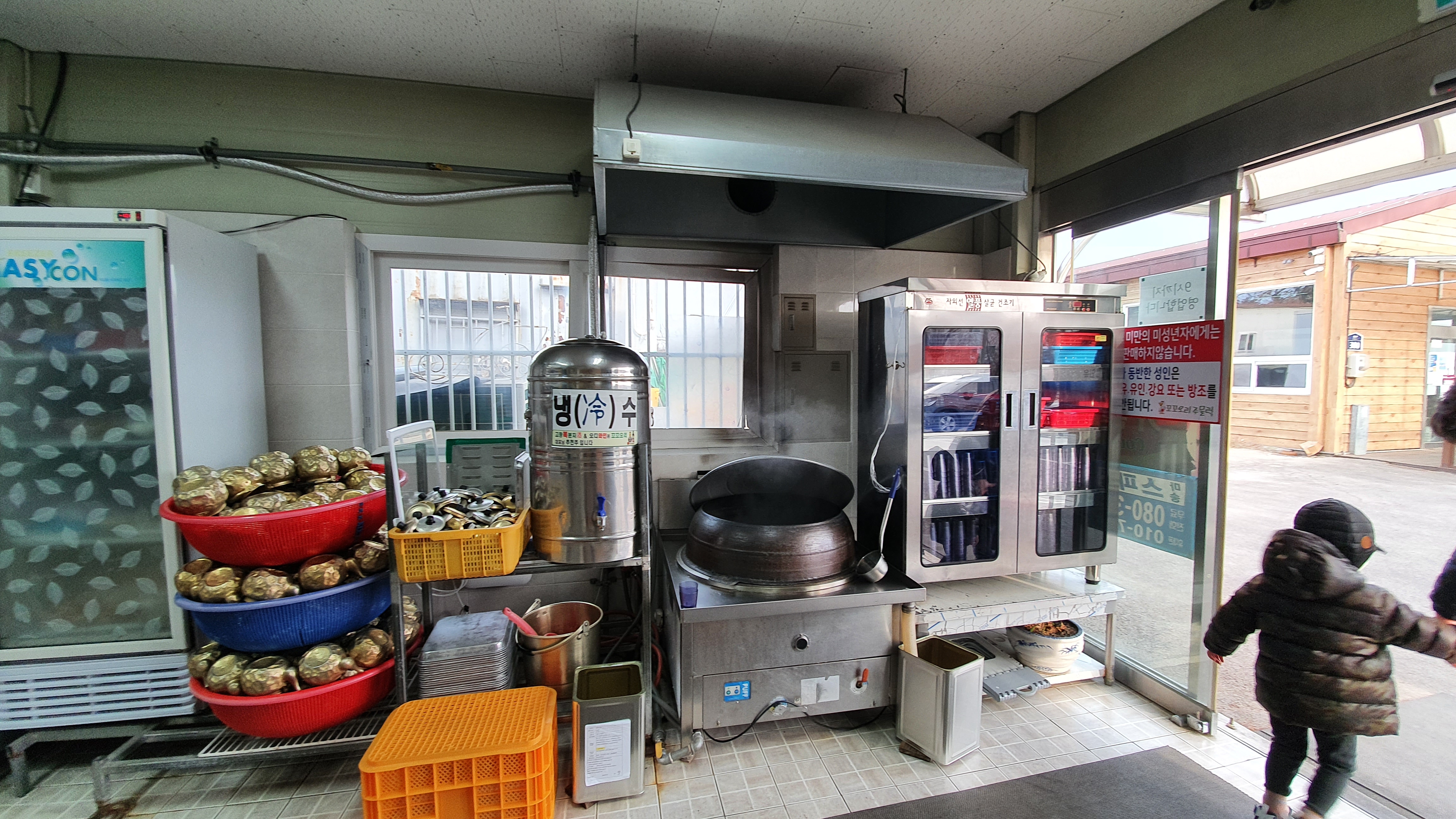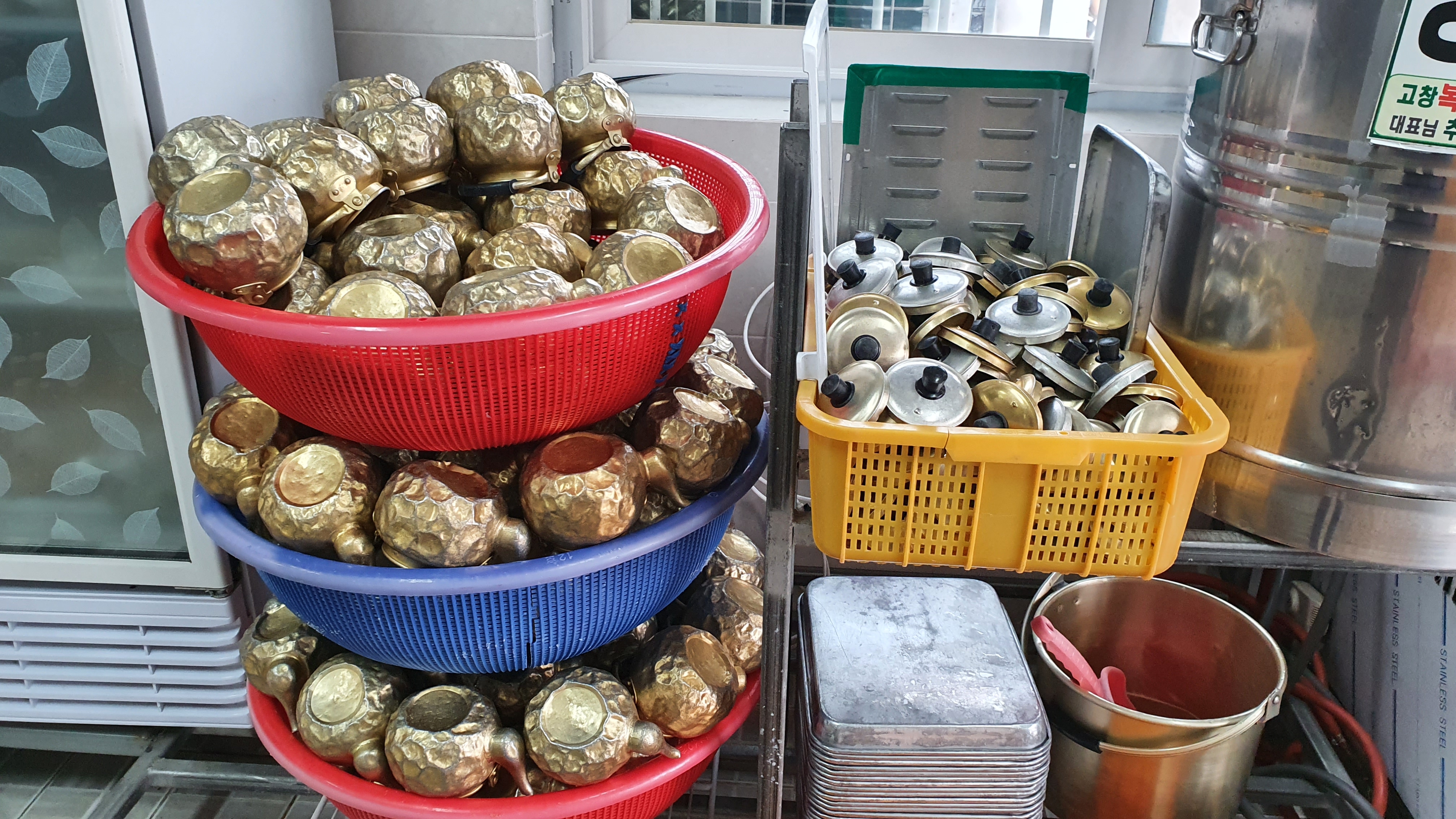 카운터 오른편에 위 사진처럼 주전자가 엄청 올려져 있고, 냉수와 온수 (차 인지 모르겠습니다. 따뜻한 물 같아요)가 있어요. 온수는 먹어보지 않아서 모르겠지만 어떤 걸 우린 물 같았습니다. 주전자가 엄청 찌그러져 있는데 ㅎㅎ 엄청 정감 있어 보이고 좋더라고요~^^ 보기만 해도 구수한 느낌이랄까요~