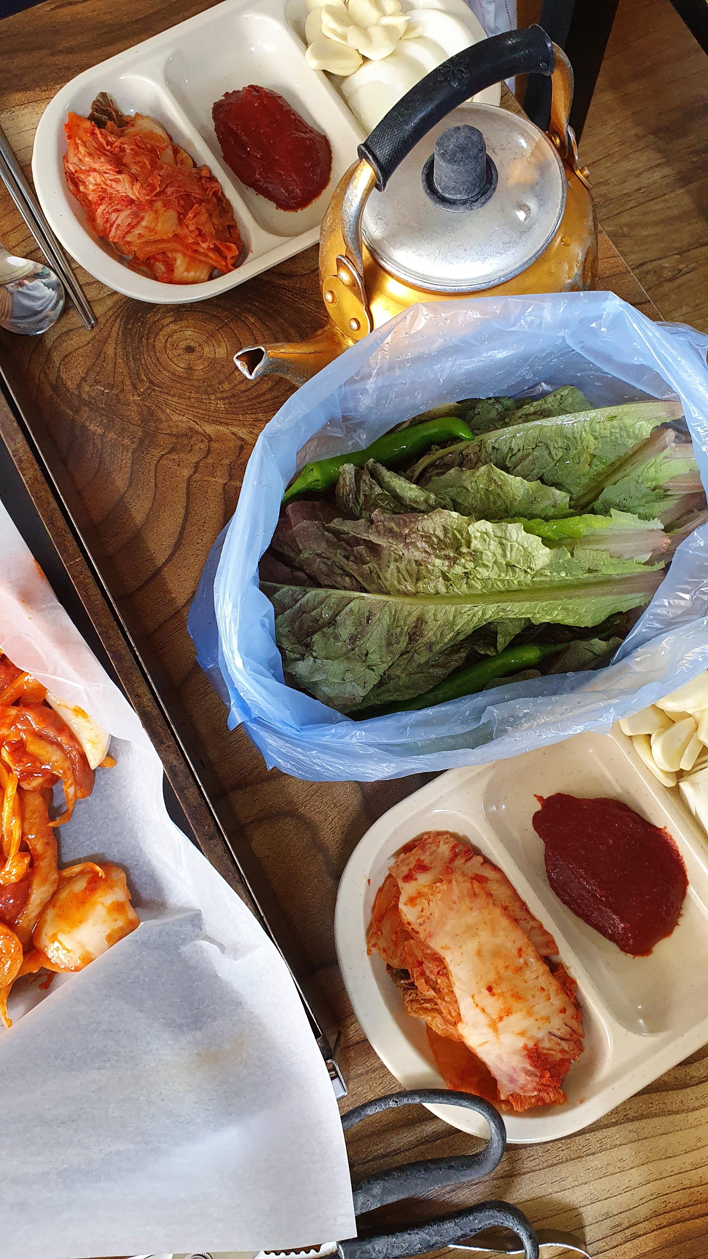 기본찬은 마늘 / 양파 / 김치 / 상추 및 고추 이렇게 준비되어 있네요~ 상추 추가 주문 시 별도 1000원 카운터에서 구매해야 하는 것은 참고해 주세요.~