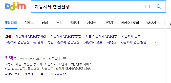 포털 사이트에서 '자동차세 연납신청'을 검색하시거나 위택스를 바로 검색하셔도 됩니다. 저희는 위택스 홈페이지로 이동을 할 거예요~^^