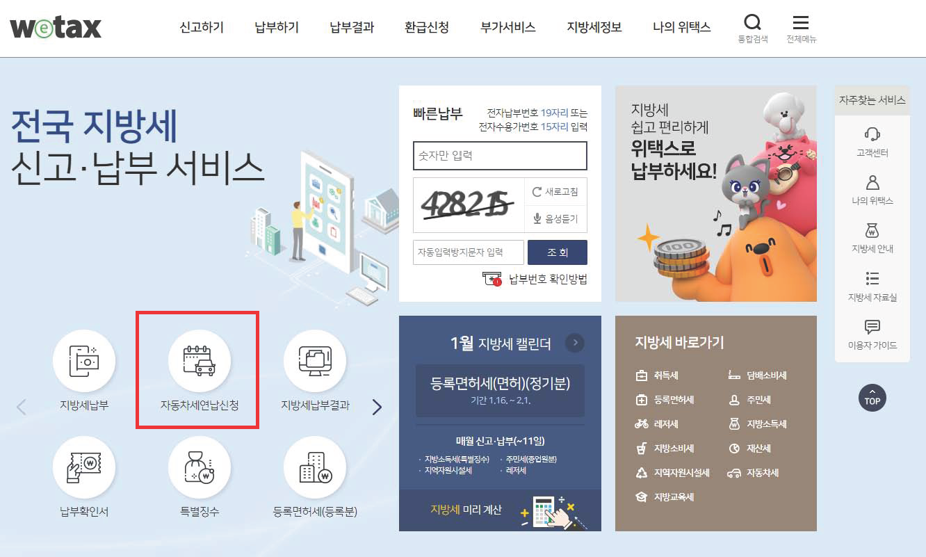 위택스 홈페이지에 들어오시면 왼쪽 중간 부분에 빠른 이동 버튼이 있네요. 자동차 연납신청 관련 링크를 눌러 진행하시면 됩니다.