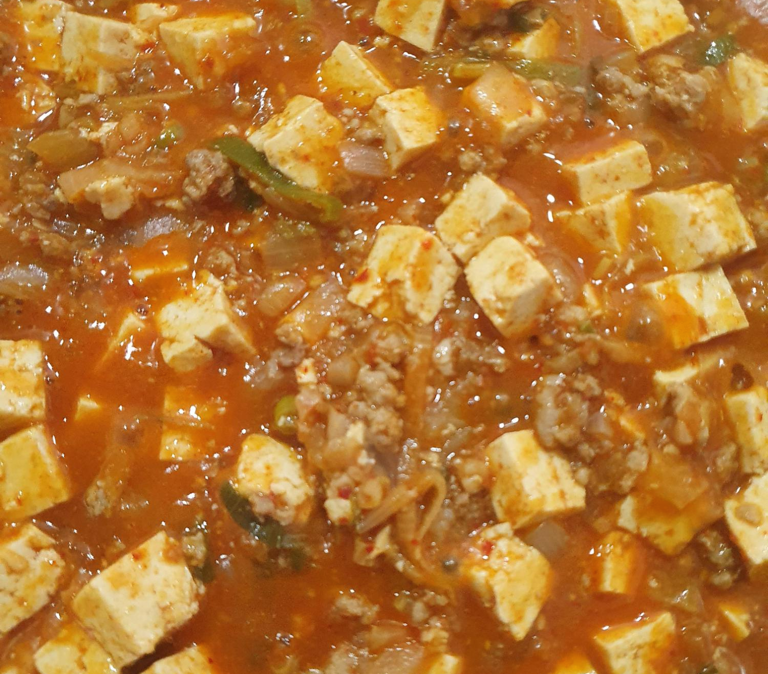 적당한 농도가 된 다음 보글보글 조금만 끓여 주시면 완성입니다. 다진 고기와 두부.. 보이시나요... 빨간색... 칼칼한 맛을 내는 마파두부 완성입니다.^^