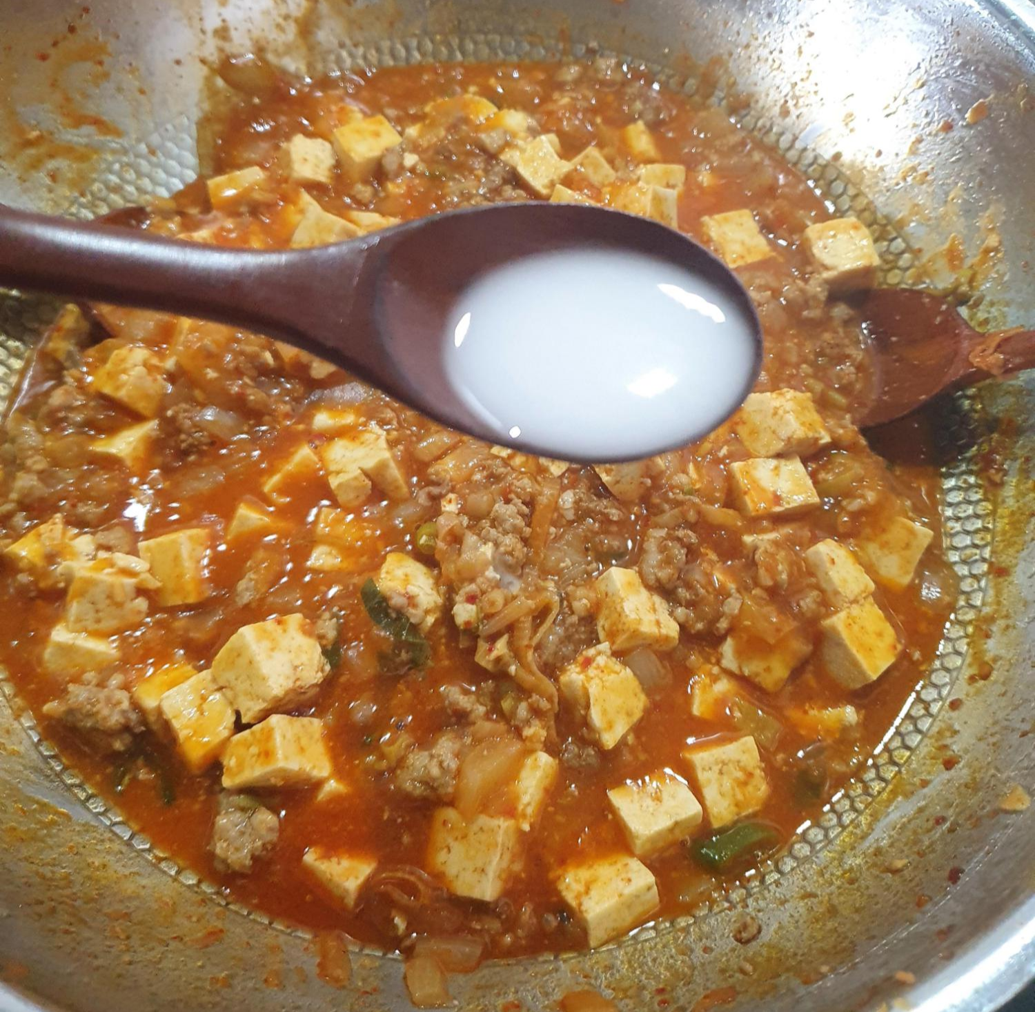 감자전분은 조리한 마파두부의 육수에 따라 정해지니 조금씩 넣어가면서 농도를 맞춰주세요. 한 번에 다 넣으면 마지막에 마파두부를 망칠 수 있는 우려가 있으니, 한수저 반수저 이렇게 조절해 가면서 넣어 주시길 바래요.^^