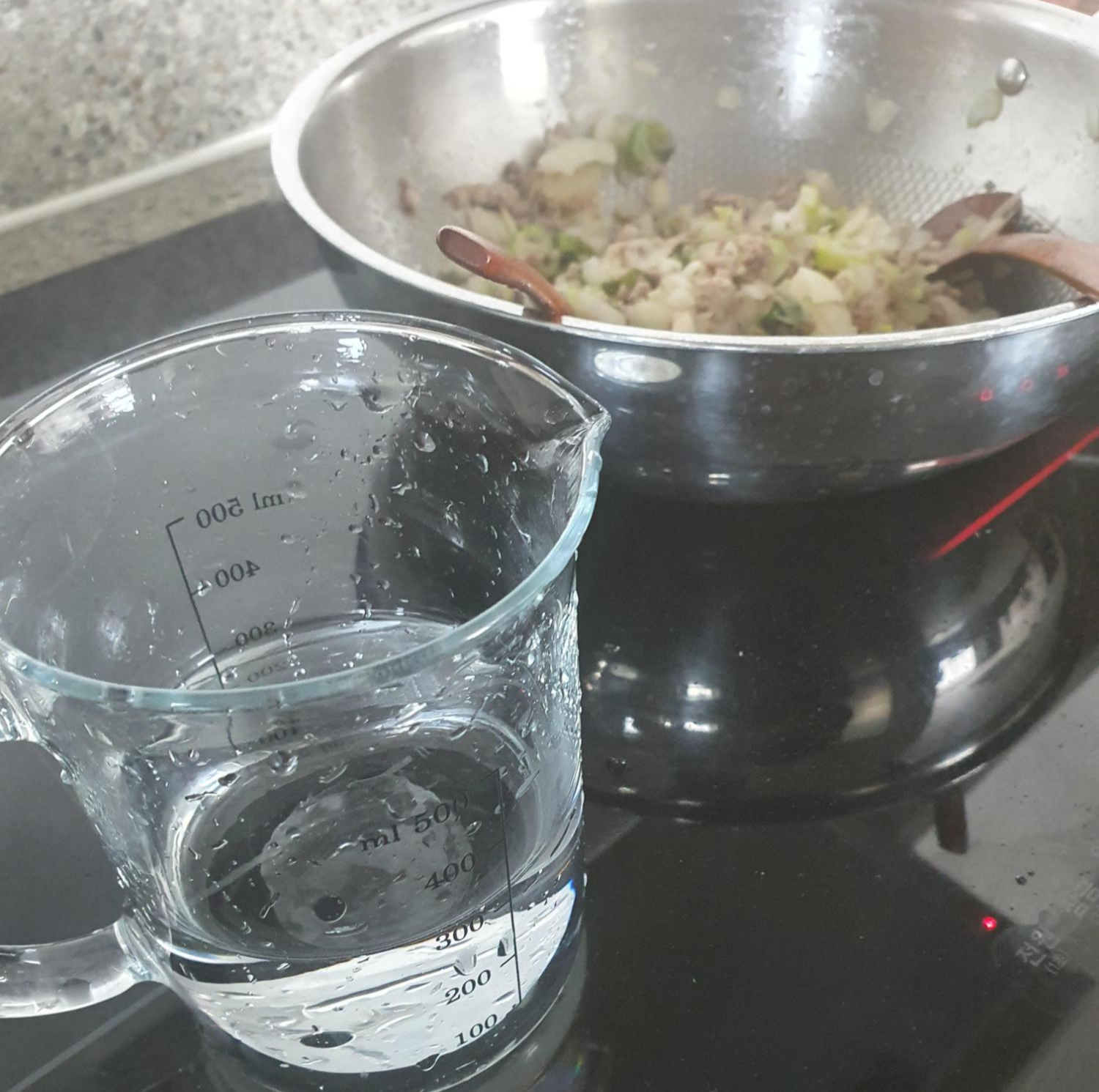 양념장을 넣기 전에 물 300ml 정도 옆에 준비해 주시는 게 좋아요. 양념장을 넣고 볶아 줄 때는 센 불에 볶아 주기 때문에 자칫하다가는 양념이 팬에 눌어붙게 되니, 양념장을 넣고 볶아 준 뒤 바로 물을 부어 줄 수 있도록 세팅해 주세요.