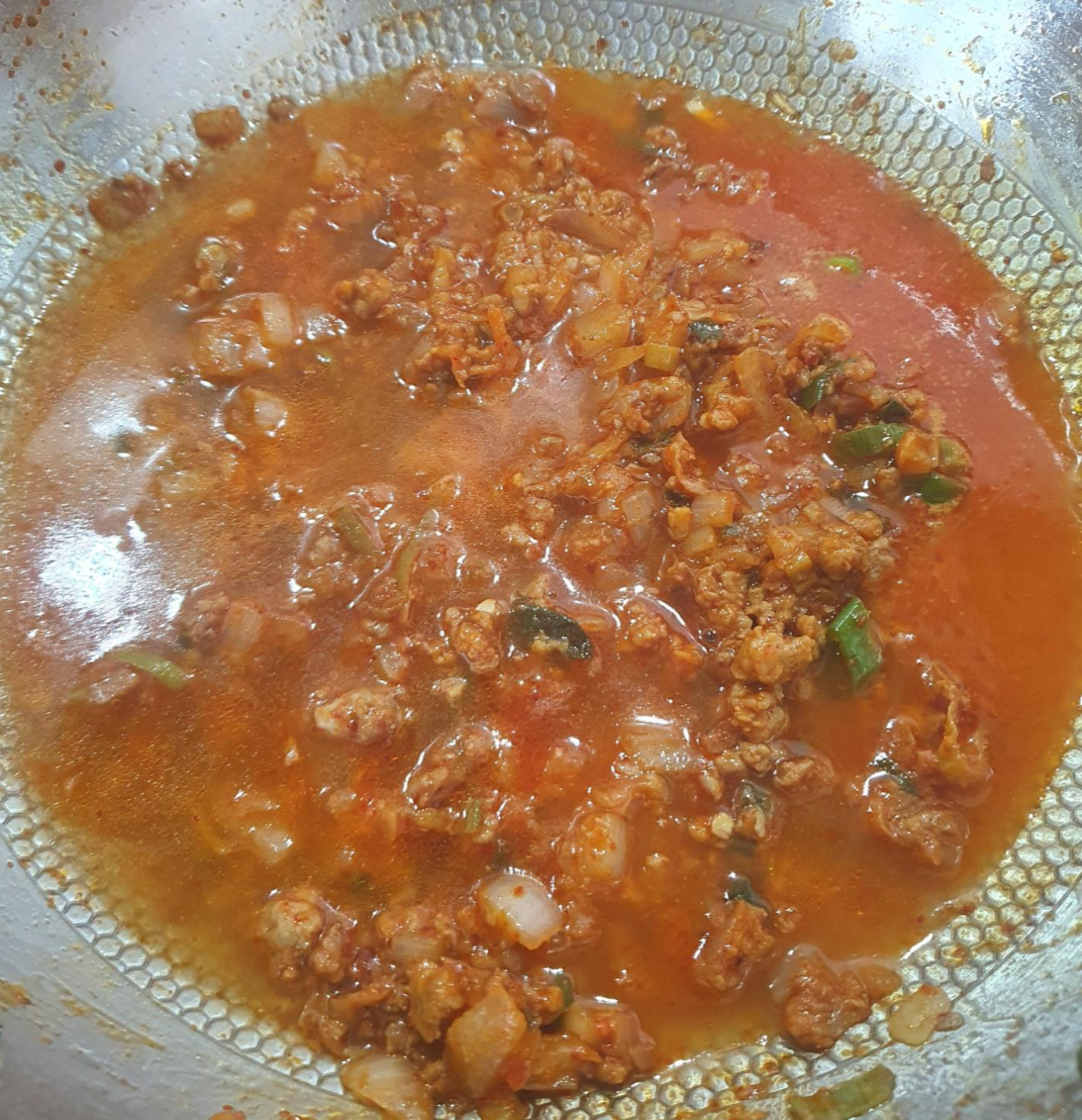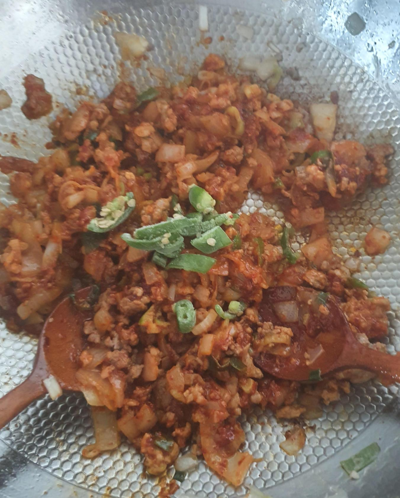 다진 고기를 추가로 넣고 볶아 주세요. 수저 2개로 뒤집어가면서 고루고루 익혀지면서 볶아지도록 바쁘게 움직여 주시면, 고기가 어느새 익어갈 것입니다.