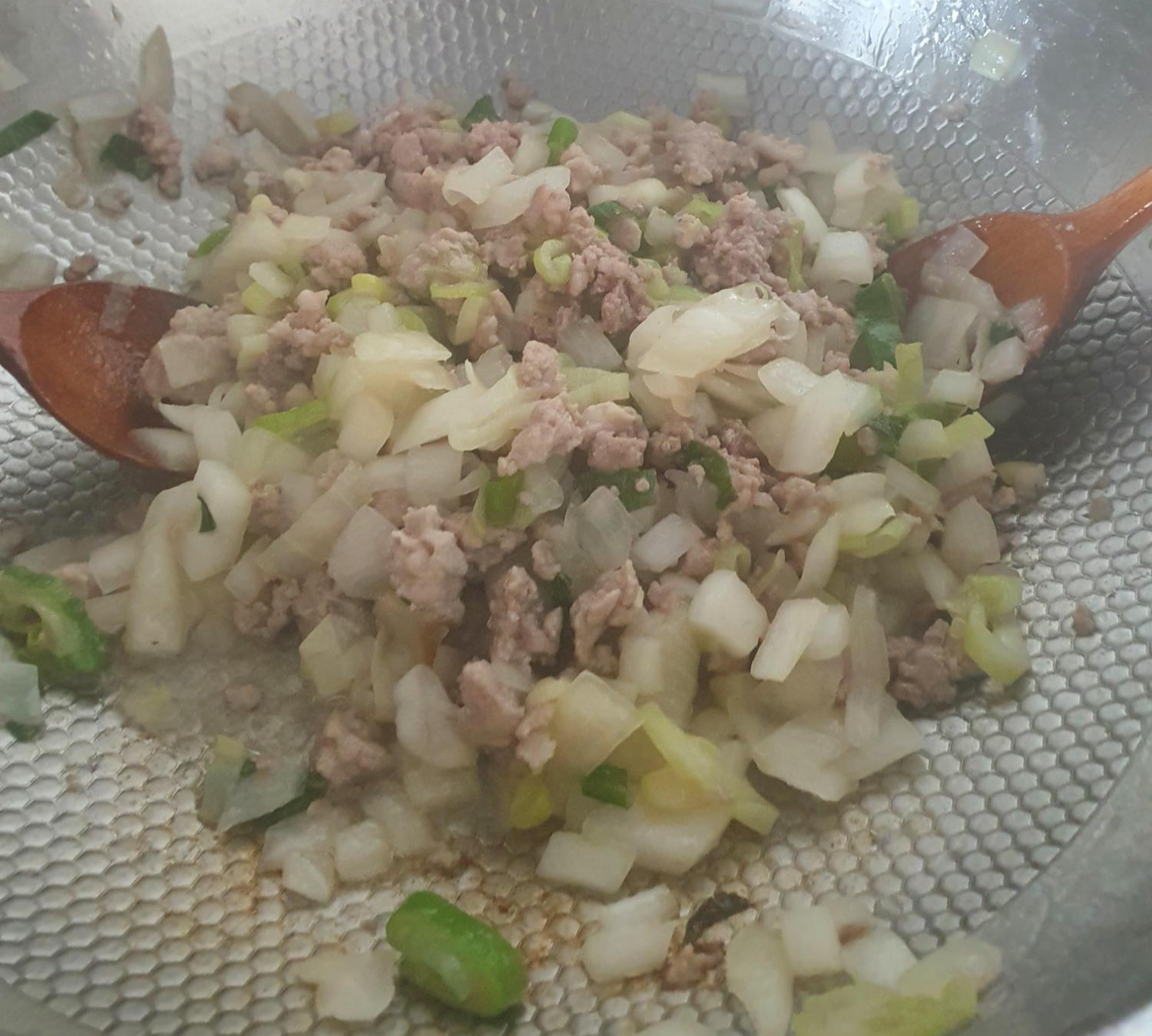 파 기름을 낸 후에 잘게 썰어 놓은 양파를 넣어 볶아 주기 시작합니다. 양파의 수분이 날아가면서 양파 색이 살짝 투명색으로 변하려고 할 때쯤 고기를 추가로 넣고 볶아 줄 것입니다.