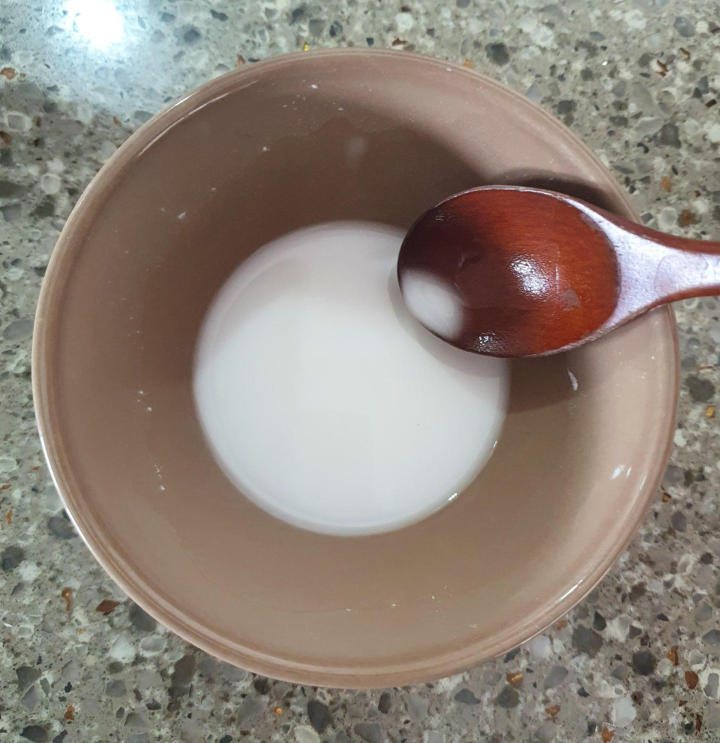 이제 농도를 맞추는 일만 남았군요~? 농도는 감자전분으로 맞출 것입니다. 감자전분을 물과 잘 섞어서 준비해 주세요.