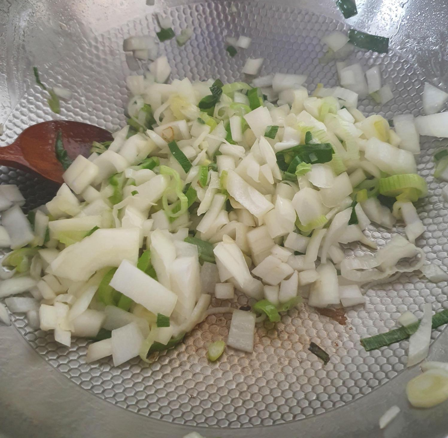 달궈진 팬에 기름을 두른 후, 파 기름을 먼저 내 줄 거예요. 파에서 수분이 다 나올 수 있도록 볶아 주시는 것이 포인트입니다. 달달달달 볶아 볶아~^^