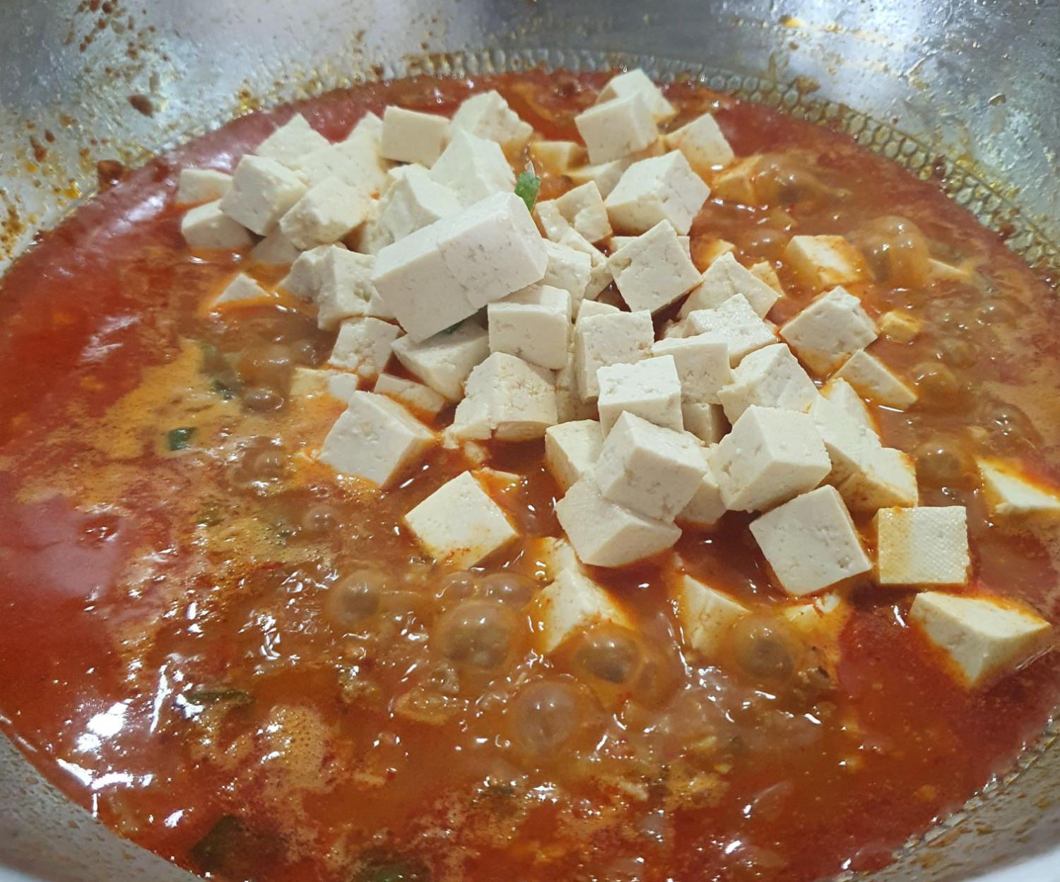 따뜻한 물을 부어놓은 것이 아니기 때문에 다시 끓어오를 때까지 시간이 좀 걸려요. 물이 끓어오르기 시작하면 이때 두부를 넣어 주시면 되겠습니다.