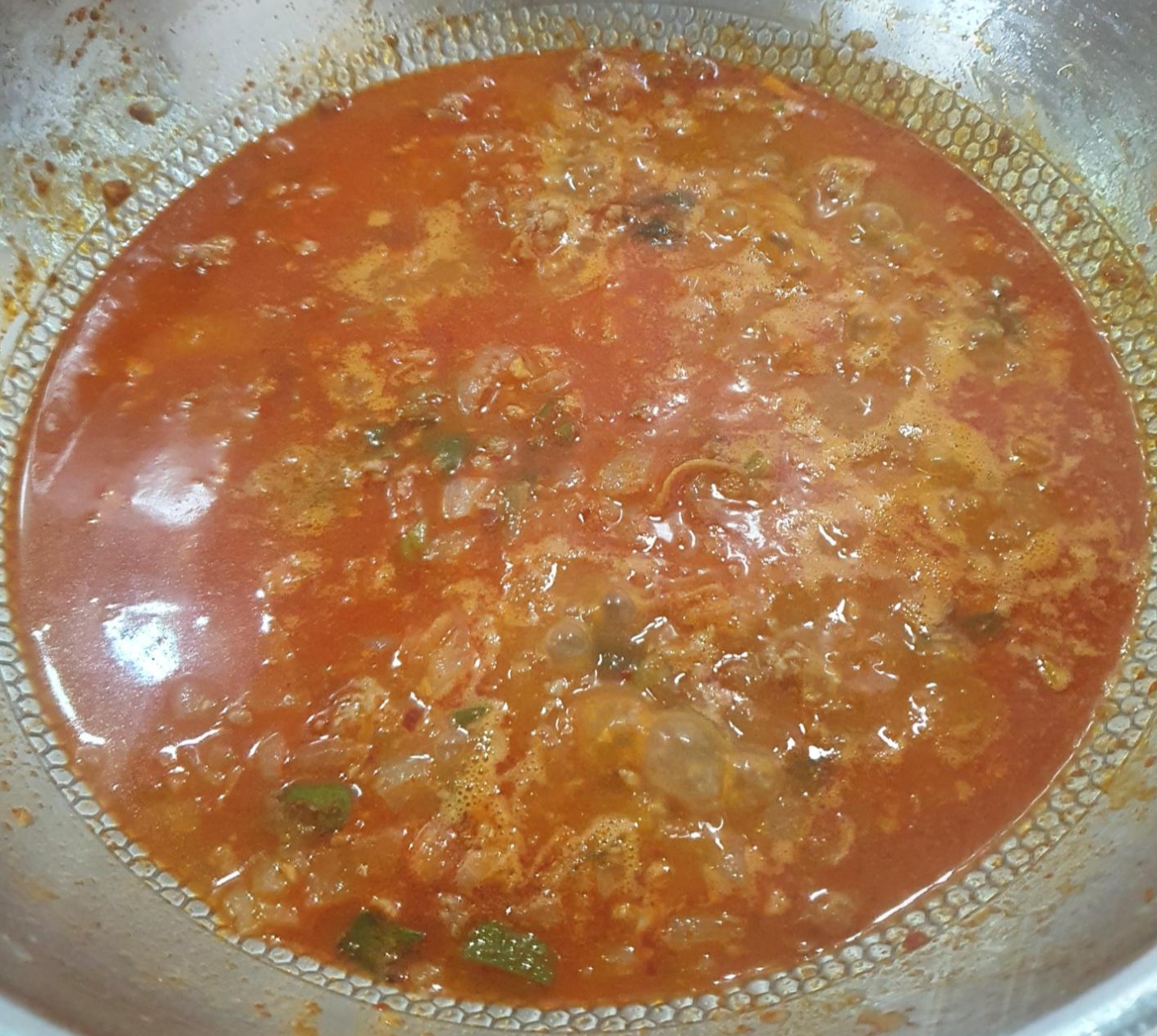 재료와 양념장이 잘 볶아졌다면 바로 물을 부어야 한다고 말씀드렸죠? 물을 부은 뒤 바로 재료와 잘 어우러지도록 잘 섞어 주세요. 자~ 드디어 이제 거진 완성이 되어 갑니다.~^^ 조금만 더 힘내서 만들어 볼게요~^^