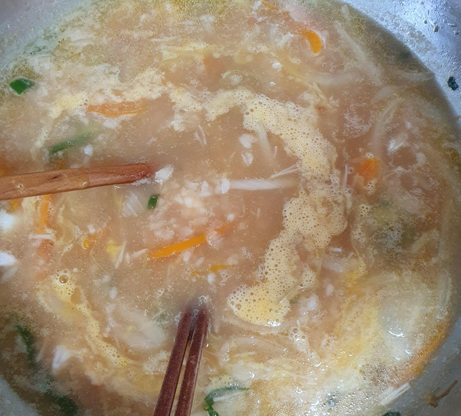 이제 모든 과정이 끝났습니다. 농도만 맞추는 일만 남았네요. 농도는 감자전분으로 맞춰 줄 거예요. 전분 한 스푼을 물에 살짝 섞어서 잘 풀어질 수 있도록 준비하여 주시고, 계란탕에 넣어 주세요. 살짝씩 섞어 주시면 농도가 걸쭉하게 맞춰질 것입니다. 이제는 완성이네요. ^^ 드디어 주말 아침식사로 맛있게 먹을 수 있는 누룽지 계란탕 완성입니다.^^