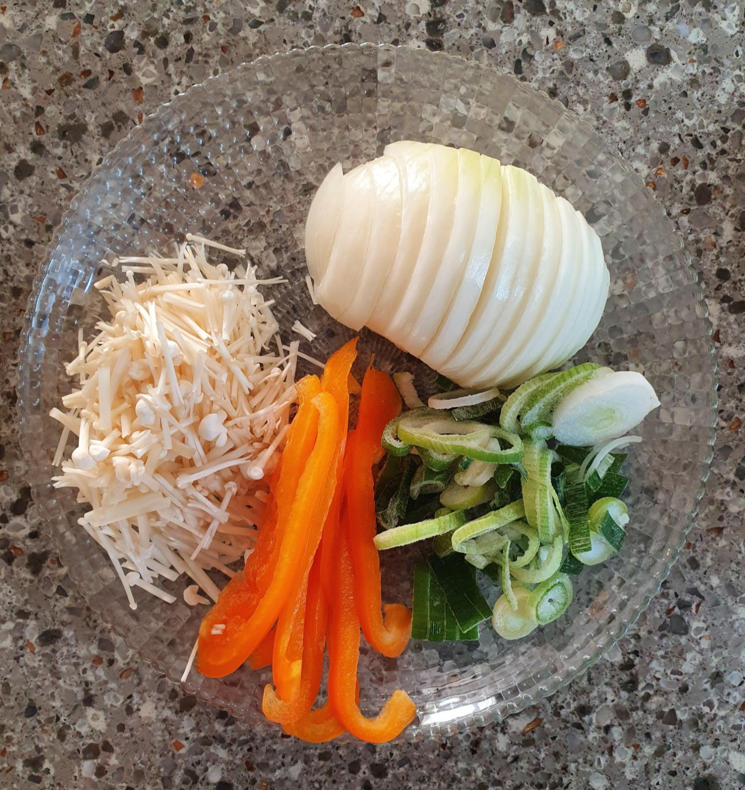 일단 야채 준비부터 해주실 께요~ 양파 및 파프리카는 채를 썰어서 준비해주시고, 팽이버섯은 잘게 썰어주세요. 저희는 아이와 함께 먹어야 하니 팽이버섯을 작게 썰었지만, 어른만 드신다면 그냥 넣어주셔도 될 것 같아요.