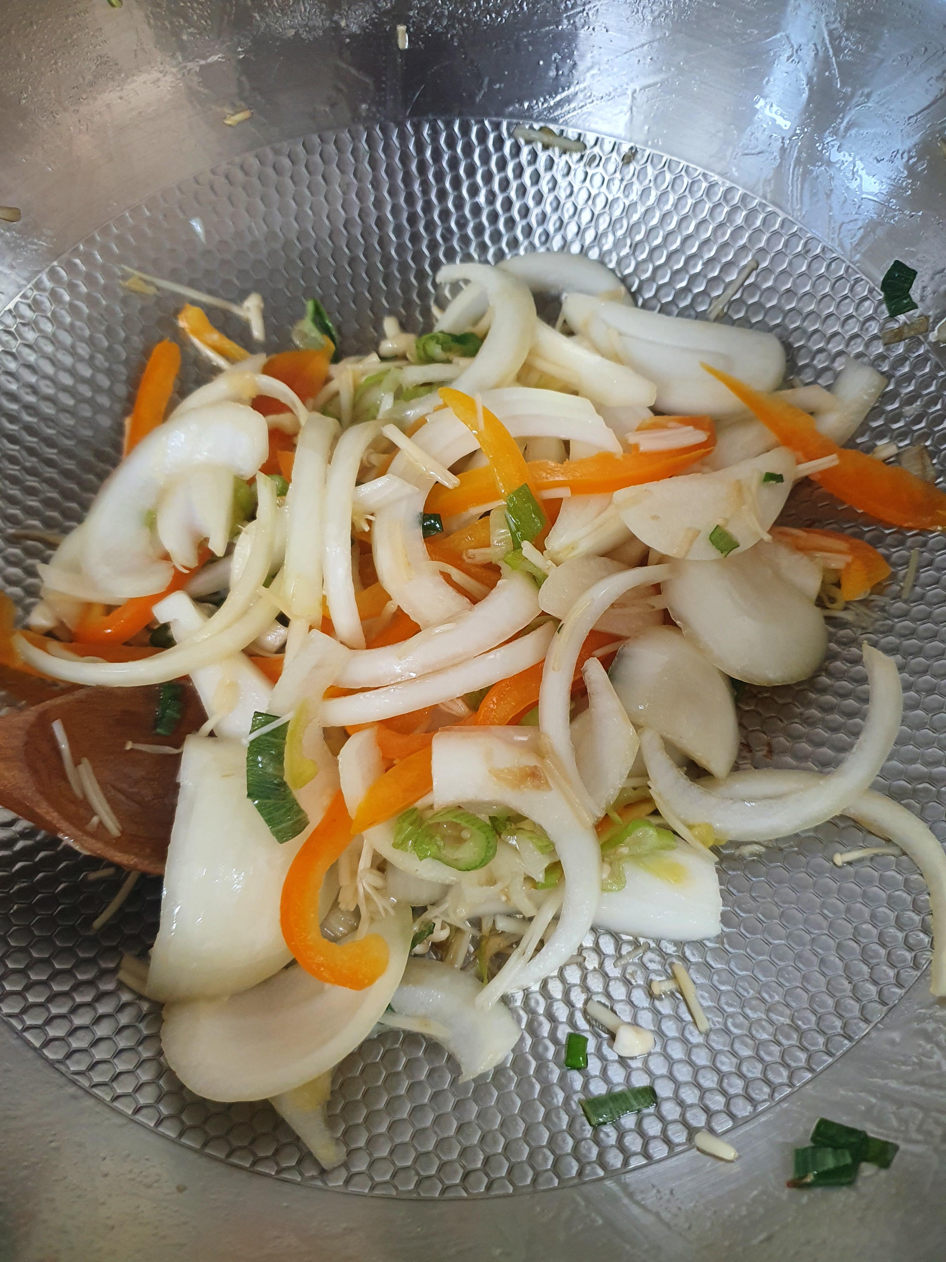 파 기름이 완성되면 손질해 놓은 야채를 넣고, 굴소스와 간장을 넣어 볶아 주세요.^^ 볶는 정도는 양파가 투명한 색이 띌 정도까지만 볶아주시면 됩니다.~^^