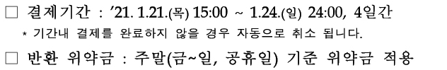예약을 하더라도 결제가 진행되지 않으면 취소 될 수 있습니다. 예약을 하고 기한 내 결제를 해 주셔야 하니 잊지 말고 결제하여 주시길 바래요. 꼭 기한 내 결재를 진행해야겠습니다.