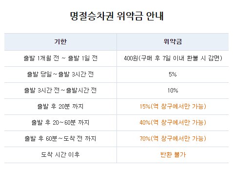 예매를 할 때 신중히 해야 겠습니다. 승차권 취소 관련 위약금이 안내되어있으니 취소 시 해당 기간을 확인하시어 취소를 진행해야 해요. 취소할 일 없도록 필요한 승차권을 미리 계산하시어 빠르게 진행하는 게 답인 것 같네요~