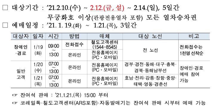 - 호남,전라,강릉,장항,중앙,태백,영동,경춘선 : 1월 21일 오전 진행