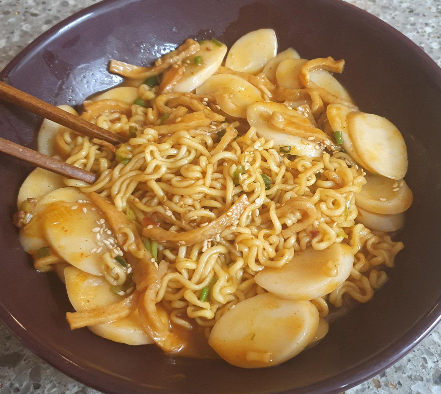 | 재료 준비 떡국떡 / 라면 1개 / 고추장 1스푼 / 고추가루 1스푼 / 설탕 1스푼 / 오뎅 적당량 / 대파 / 통깨 |