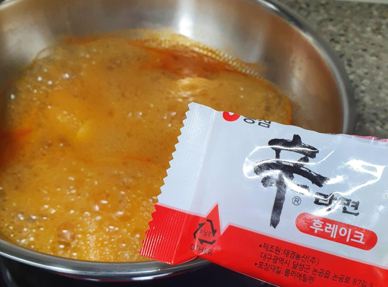 푸라면의 후레이크도 넣는 것 기억해주세요~( 간편하게 먹기 위해서 야채를 별도로 준비하지 않았지만, 양파를 썰어서 넣으면 더욱 야채의 단 맛이 풍미를 올려줄꺼에요~!^^ 참고해 주세요.)