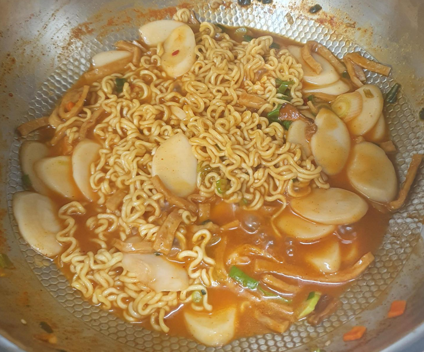 국물떡볶이보다는 약간 자작하게 해서 먹기를 원했기 때문에, 라면면발이 익을 정도의 물을 남기고 스프로 간을 조절해 줄 것입니다. 전 라면스프 반정도 사용 했어요. 참고해 주세요.