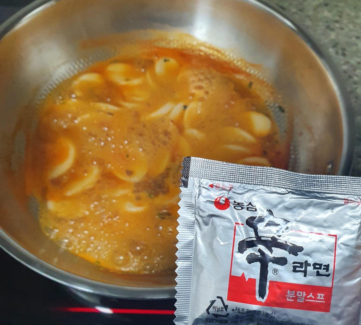 라면스프만 이용한다면 라면 맛이 강해서 별로였겠다 싶어요. 고추장과 설탕이 조금 첨가되었기 때문에 확 라볶이 느낌으로 바뀌네요~^^