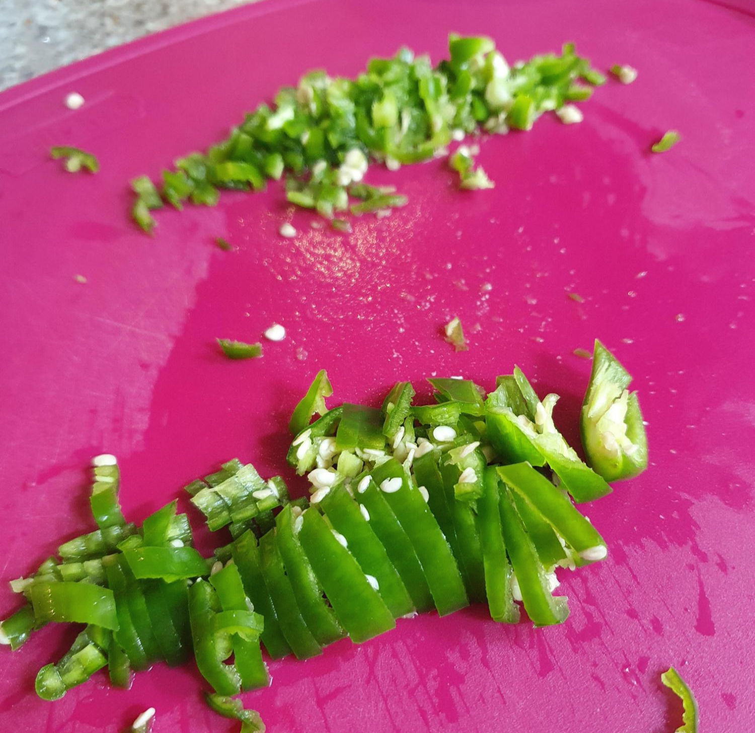 청양고추를 다듬어 주실 때에는 바로 편으로 썰어서 다져주시는 것보다 칼집을 내서 썰었을 때 조금 더 작은 모양이 나오도록 해주시는 게 좋습니다. 그럼 번거롭게 많이 다지지 않아도 어느 정도 자잘하게 다져진 상태로 썰려요.