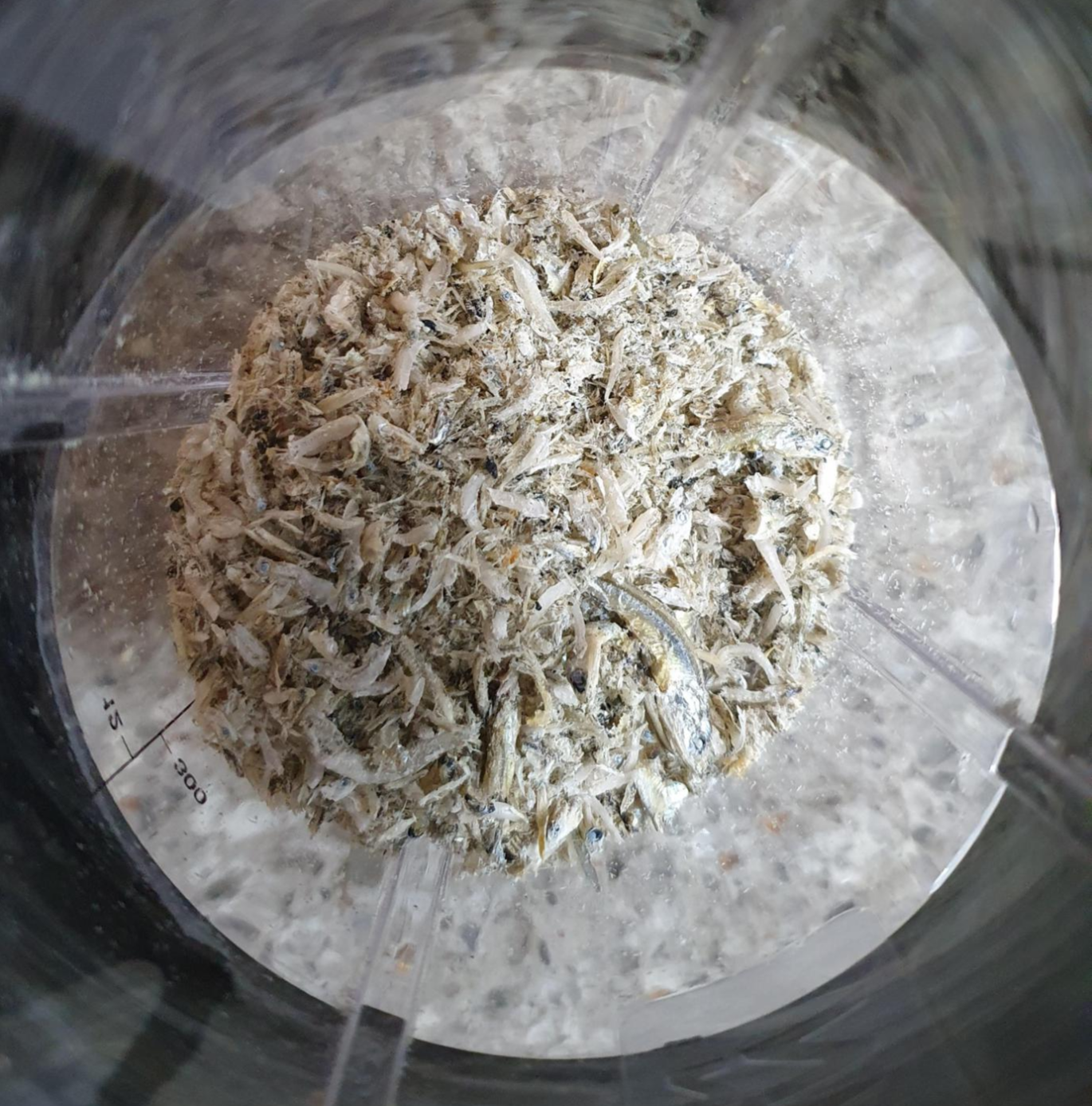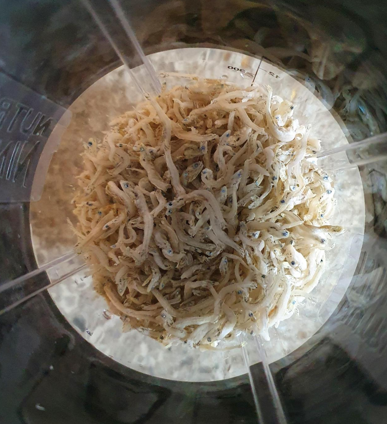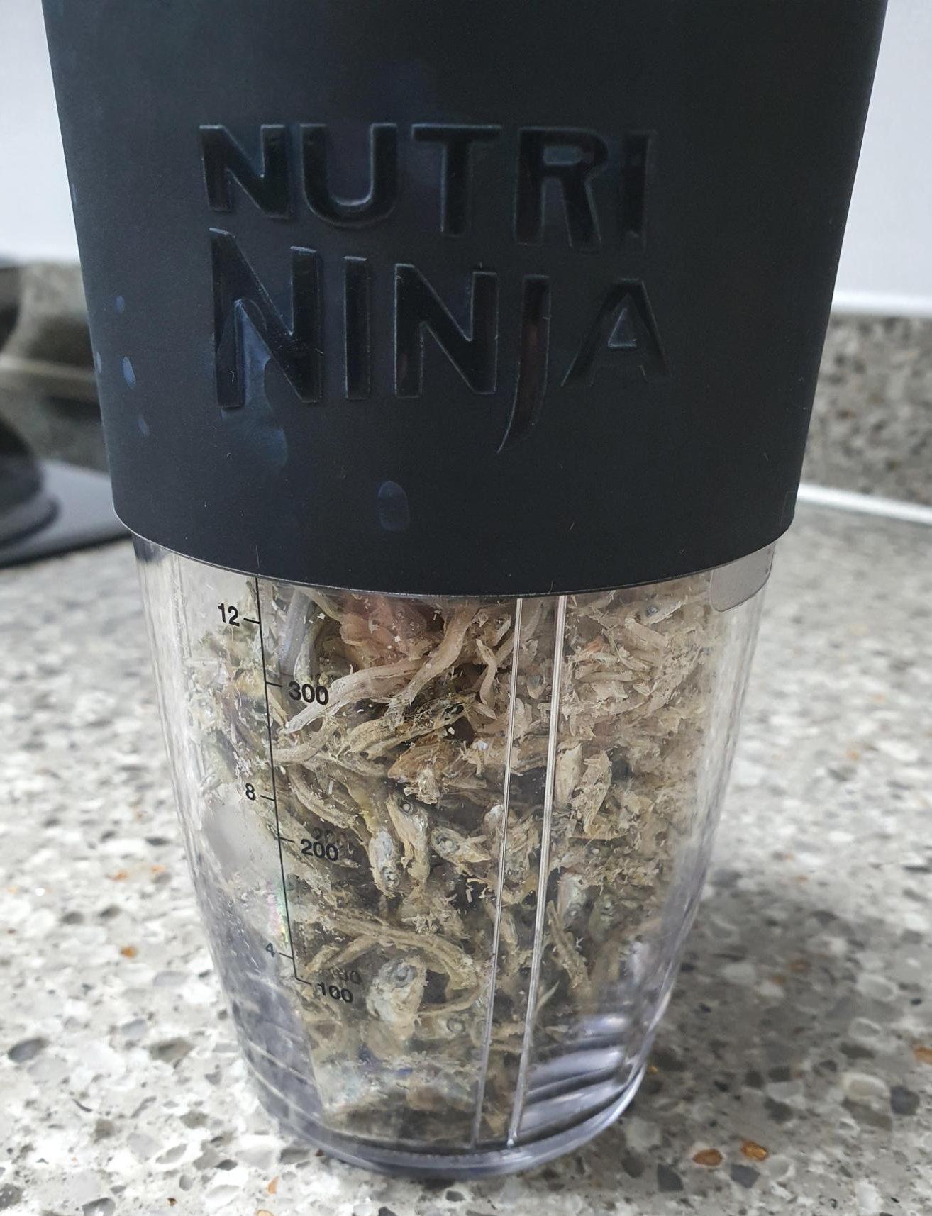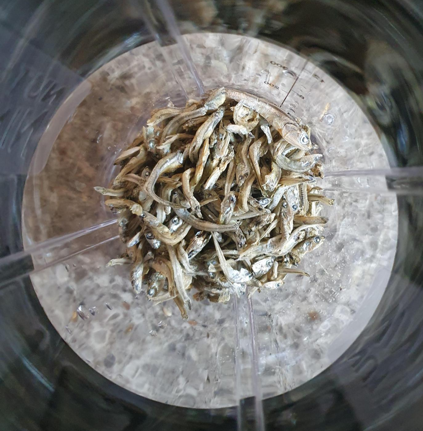 참고로, 저는 작은 멸치와 중간 멸치를 동시에 갈았어요. 이유는..... 멸치가 냉동고에 거의 다 떨어져서 한주먹 정도의 양을 확보하기 위함입니다. 멸치의 크기는 중요하지 않아요. 볶음멸치에 활용하는 멸치면 되겠습니다. 참고해 주세요.