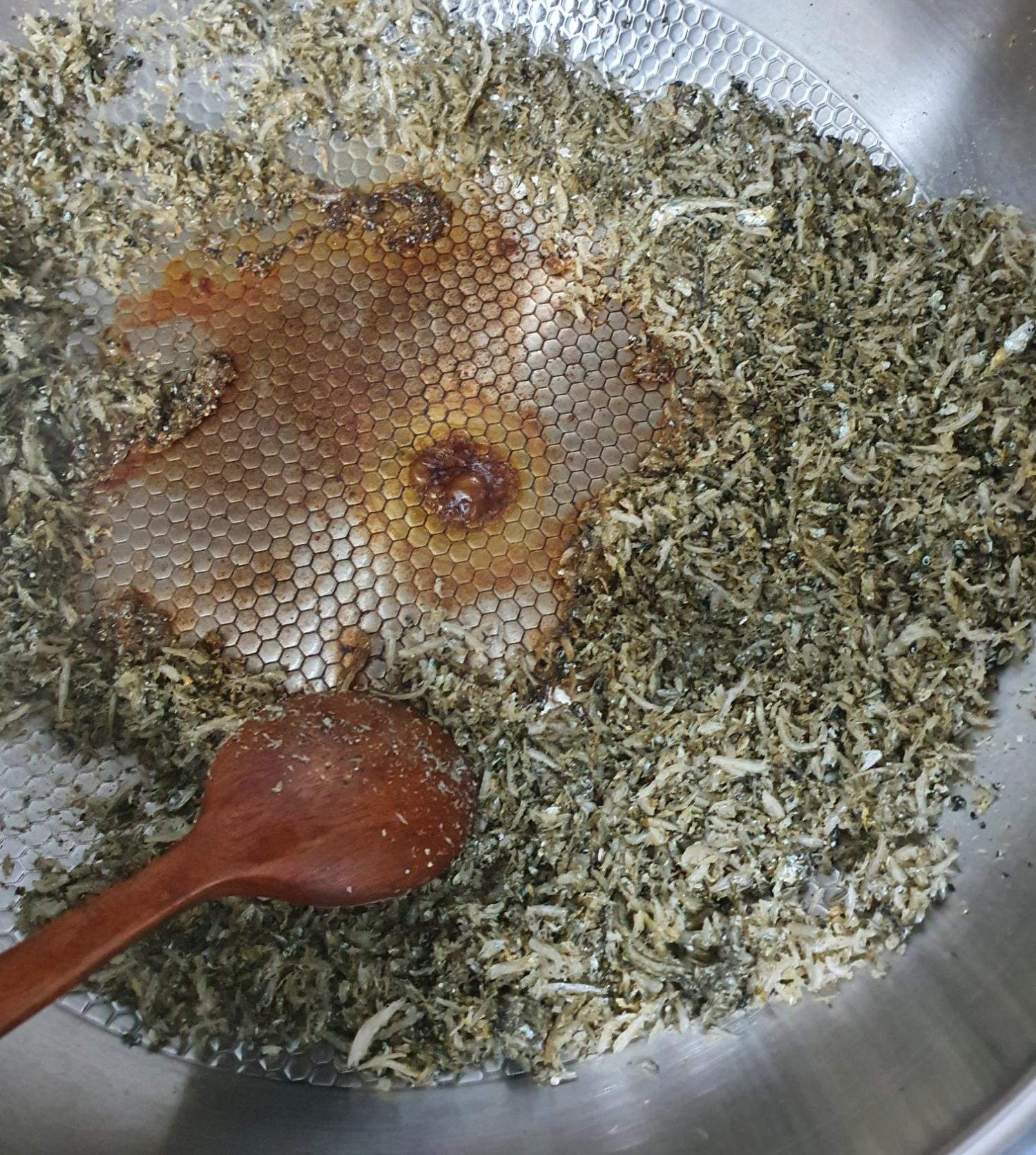 볶아 주시면 멸치가루들이 기름에 의해 뭉치게 되어있어요. 뭉치는 것을 살살살 풀어주시면서 볶아주세요~^^