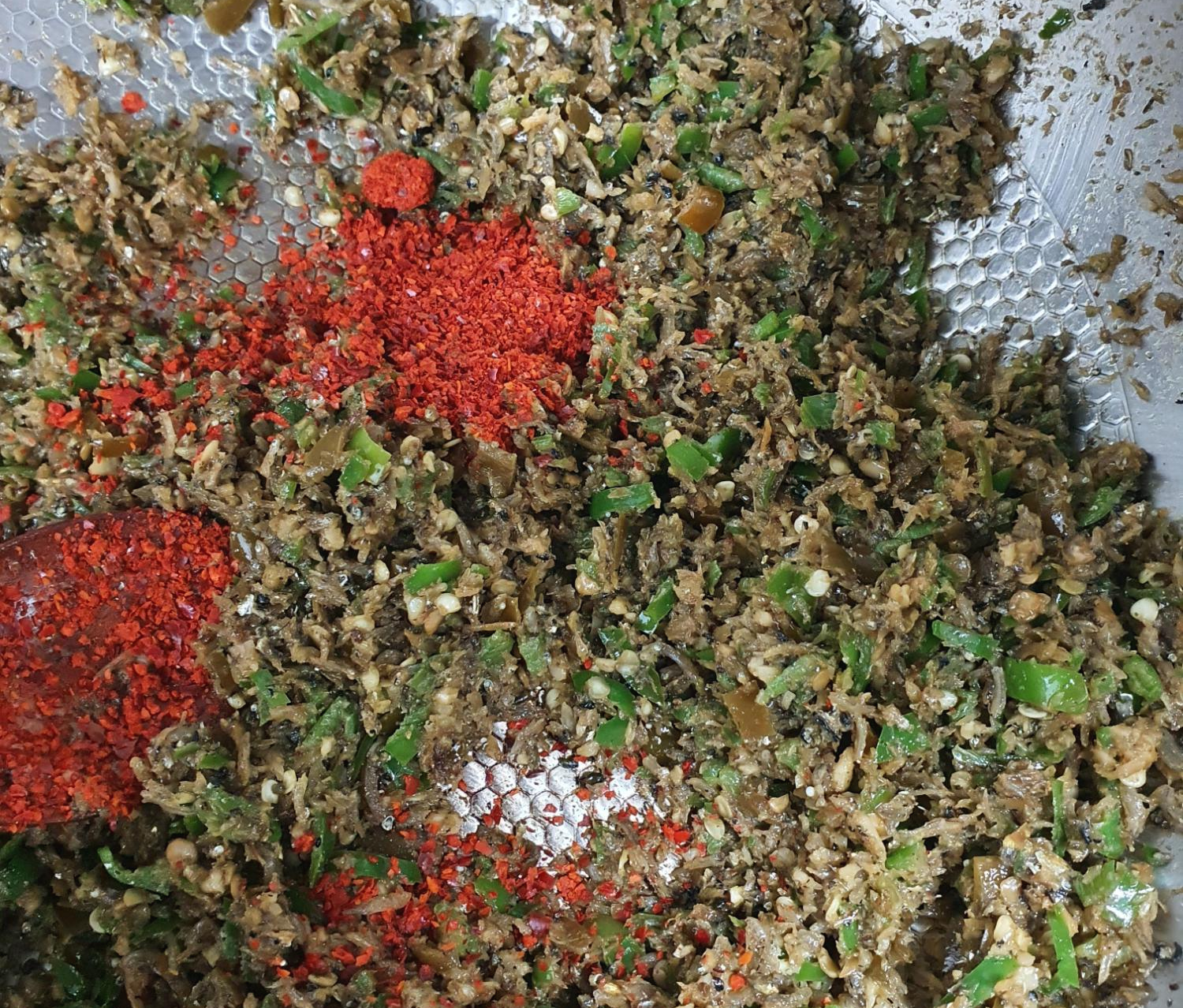자 멸치가 다 볶아지고 멸치의 간까지 입혔다면 준비해 놓았던 고추 다진 것과 다진 마늘을 한 번에 넣고 볶아 주세요~!