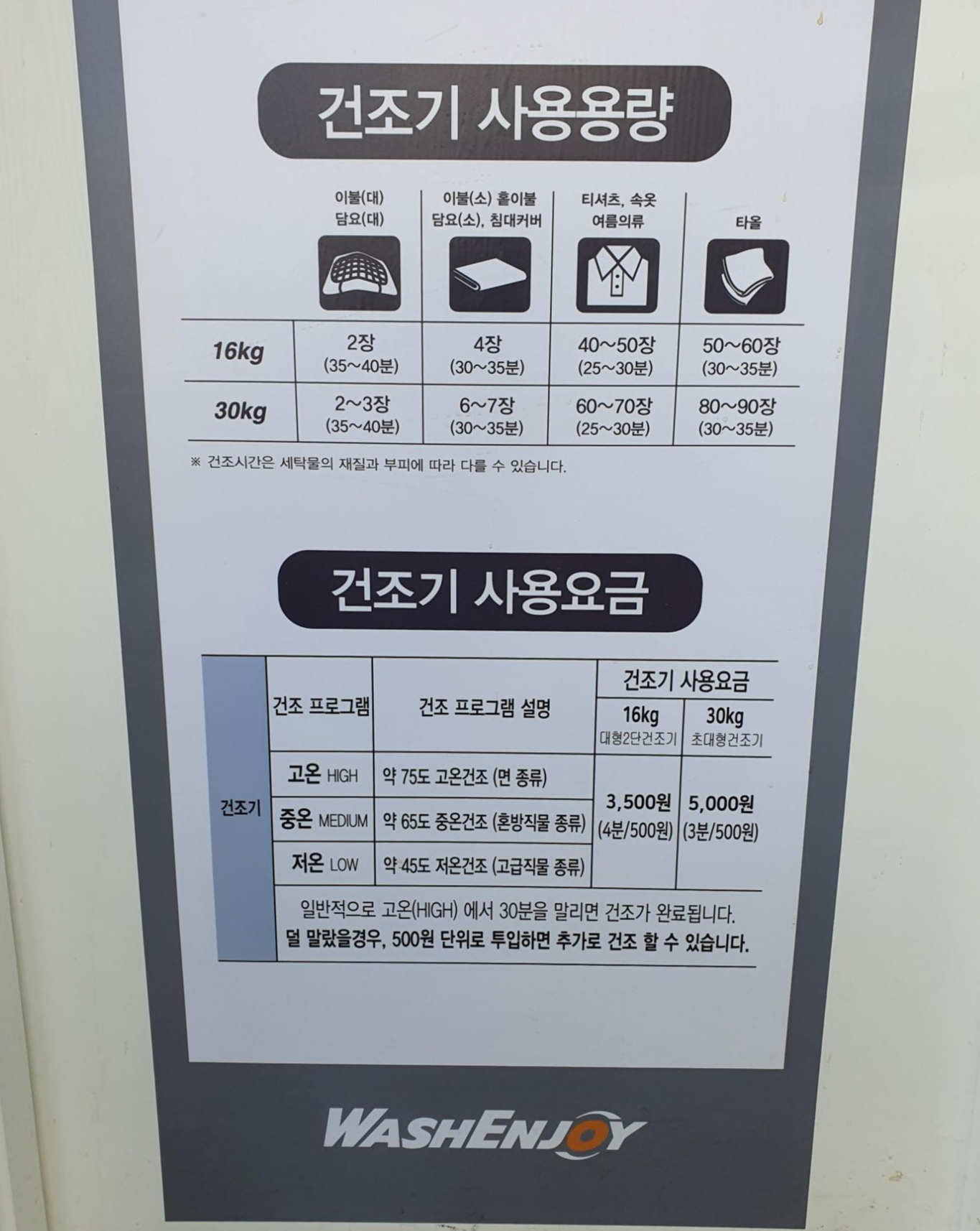 드라이존으로 이동이 완료되었으니, 건조기 사용 용량 및 사용 요금에 대해 알아봐야겠네요~ 저는 위에서 말씀드린 바와 같이 이불 3장을 진행하고 있기 때문에 30KG의 건조기를 사용해야겠어요~ 시간은 35~40분이라고 되어있지만, 전 30분만 진행할 예정이에요. 어느 정도 말리고 난 후 집에서 조금만 더 펼쳐 놓으면 싹 다 마르거든요.