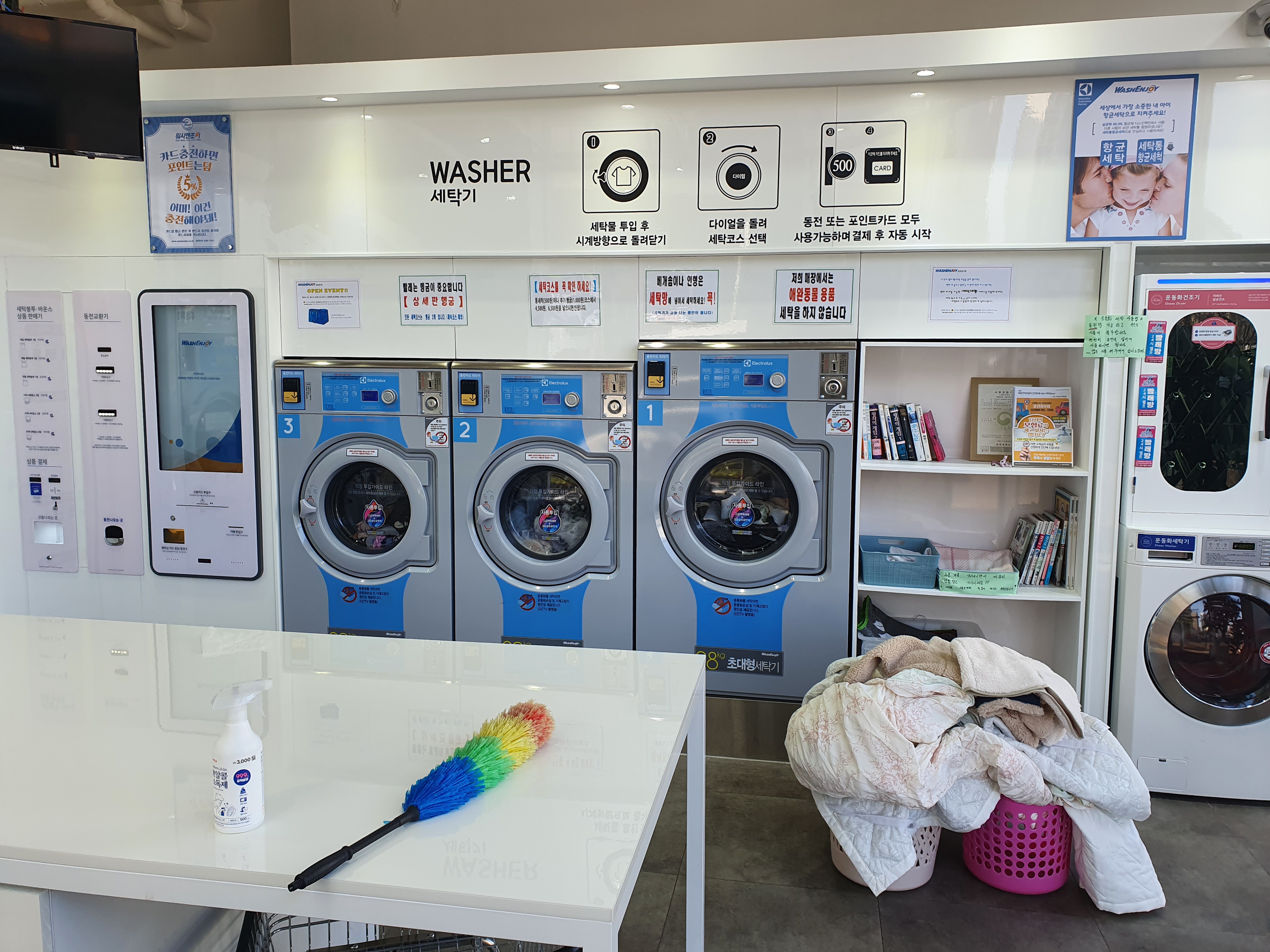 위의 보시는 워시존에서 세탁을 먼저 진행하시고 드라이존으로 이동하시는 방법입니다~^^ 빨래 바구니 및 세탁물이 줄을 서서 기다리고 있는 모습.. 저의 판단은 틀렸어요.. 오전에 가면 방문객 없겠지..라는 큰 오산이었네요. ^^ 저도 줄을 서서 기다려 봐야겠지요? 아마도 한가한 시간은 늦은 저녁시간부터가 되지 않을까 싶어요~^^ 참고해 주세요.