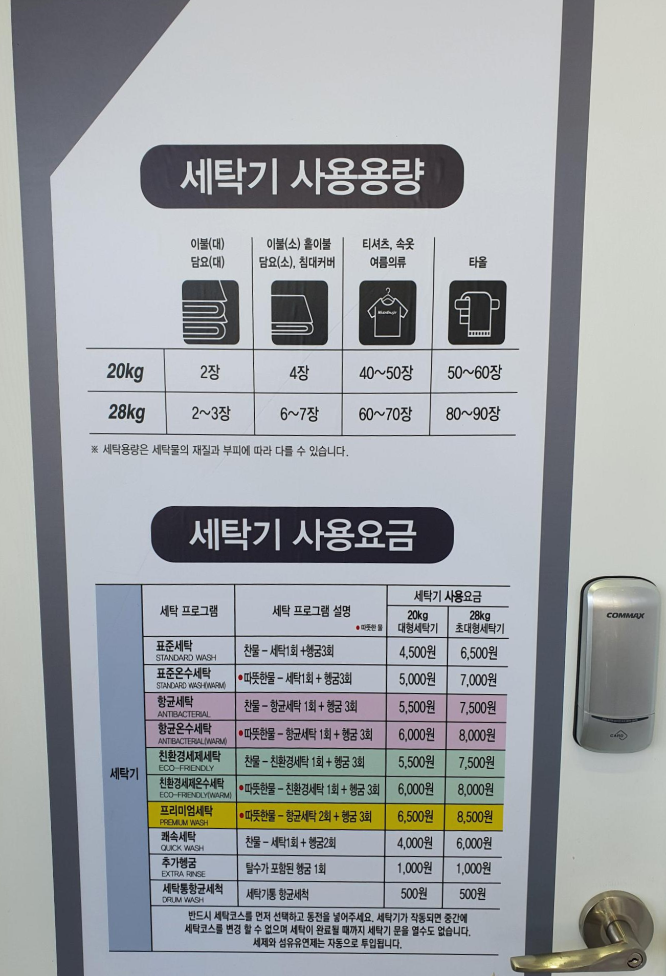 입구를 통해 처음 들어가시게 된다면 워시존이 있어요. 위의 세탁기 사용 용량과 금액을 확인하시면 되겠습니다.