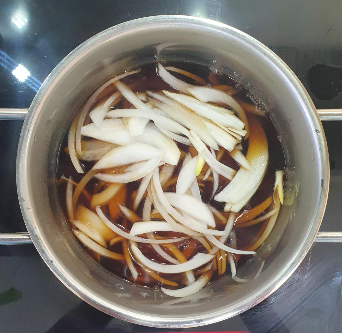 잘 걸러진 양념소스 원액에 채를 썬 양파를 넣어 줍니다. 자연의 단맛을 심어주기 위함이에요~^^ 양파가 다 익으면 소스가 완성이 되는 과정입니다. 양파가 다 익어가기 전에 저희는 무엇을 해야 할까요?^^