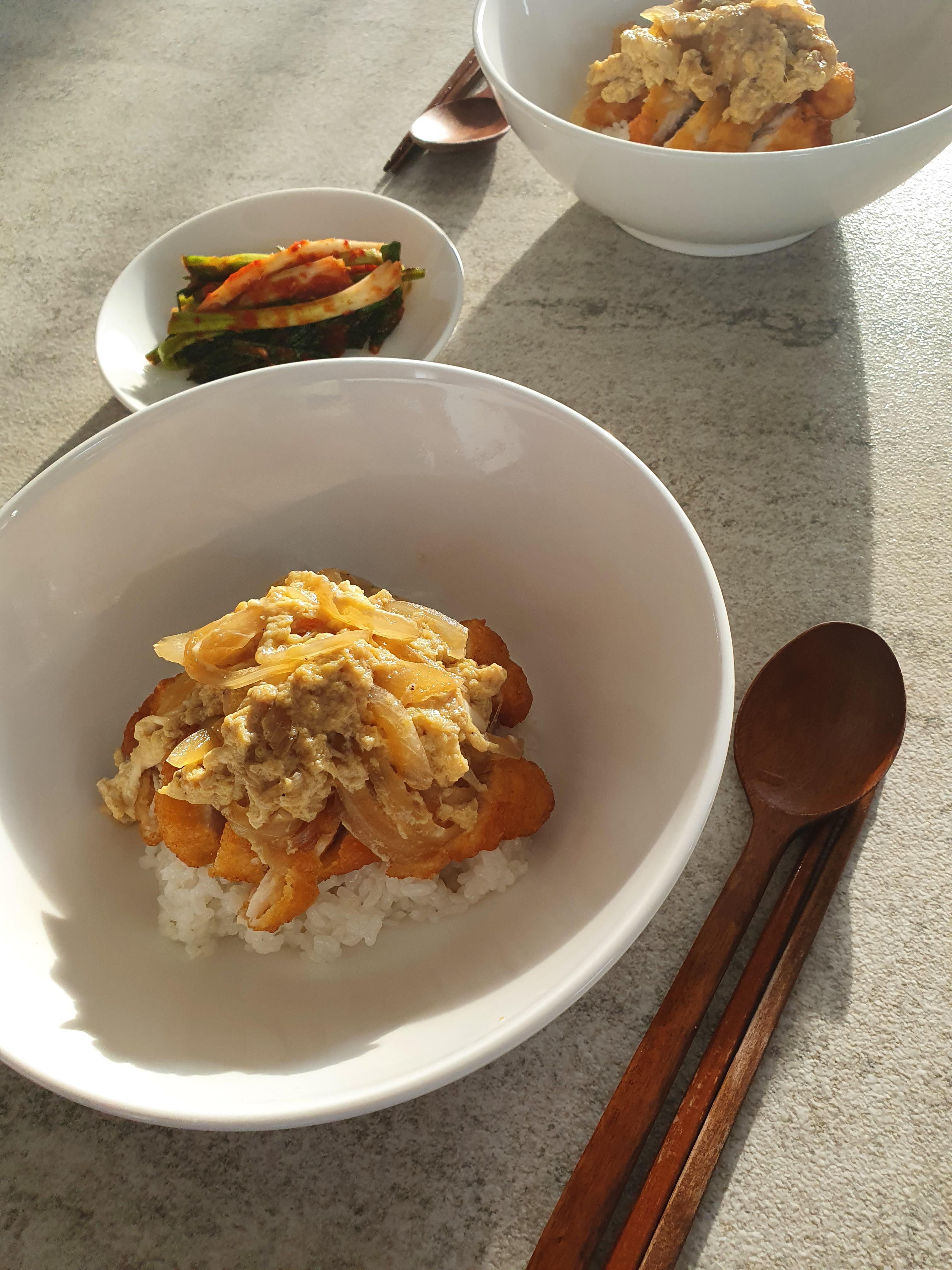 치킨가스를 별도로 만들 일이 없음으로 간단히 만들어 먹을 수 있으니, 가츠동 형식의 치킨가스 덮밥 만들어 보셔도 좋을 것 같습니다.
