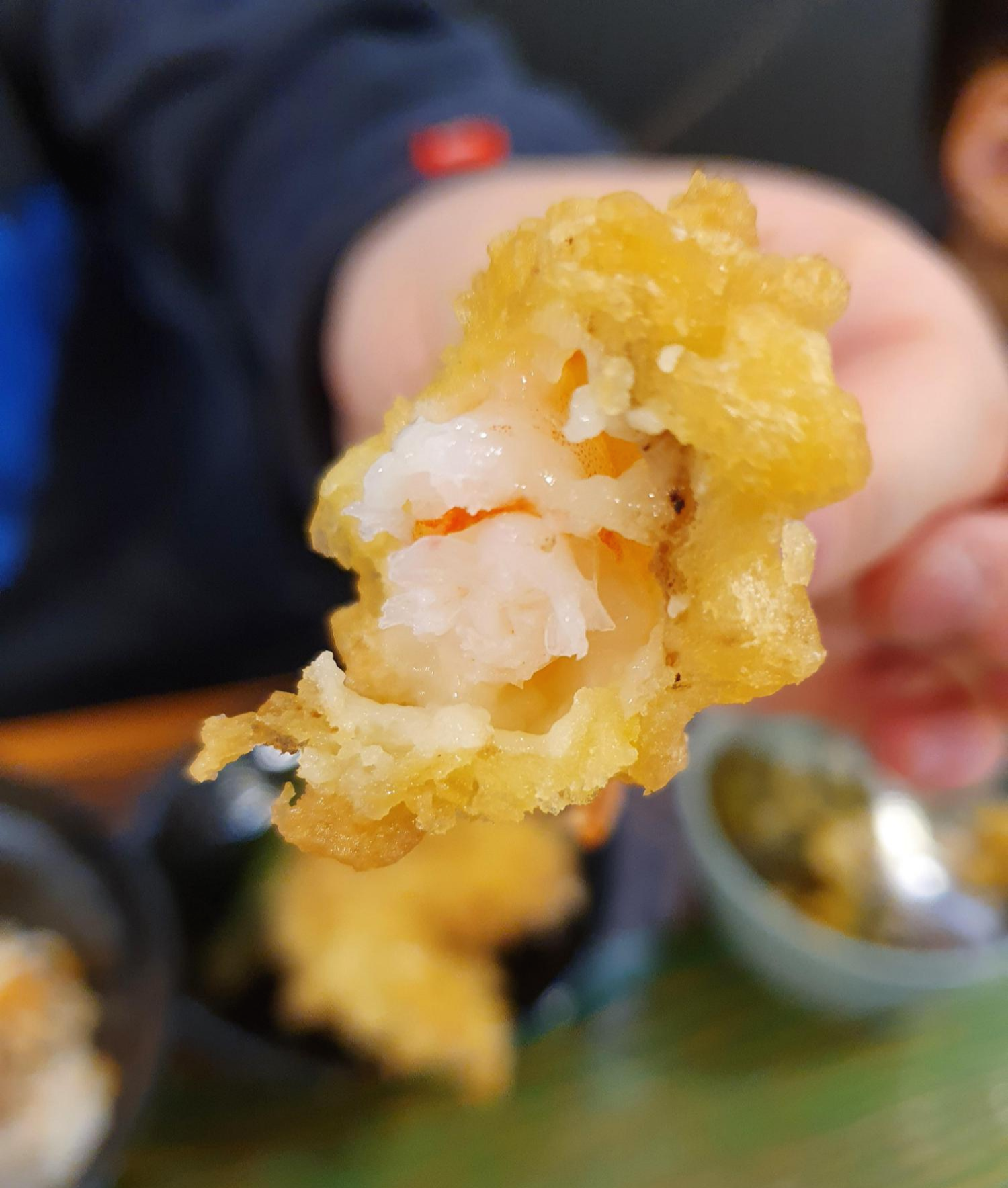 드디어 나왔습니다~ 아사리텐동과 에비텐동~! 두둥~! 에비텐동은 새우가 4마리 들어가 있는 텐동이에요. 아이에게 새우 2개를 나누어 먹을 수 있도록 주문했어요.