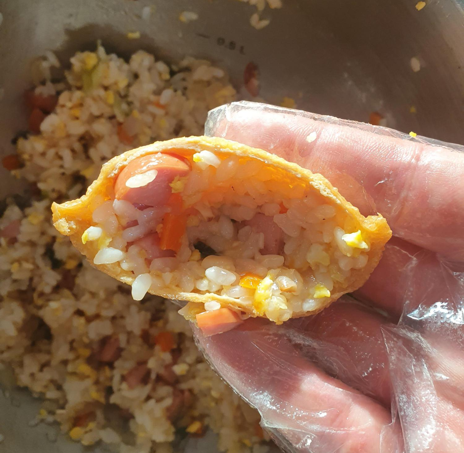 유부를 처음 보시는 분들은 알아주세요. 유부는 처음에 붙어있어요. 그래서 가운데를 벌려서 떨어트린 뒤 준비하신 재료를 넣어 완성해야 하는 순서입니다.
