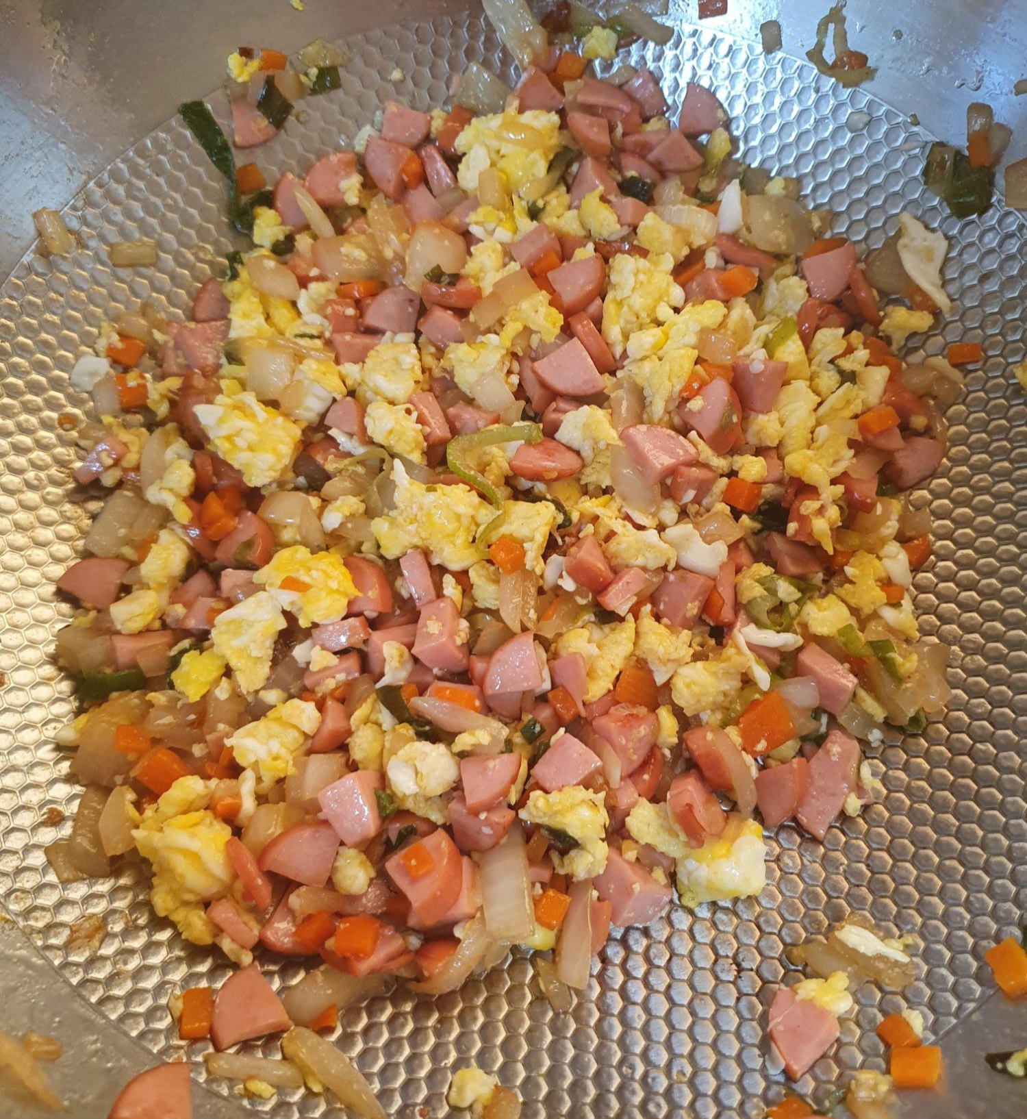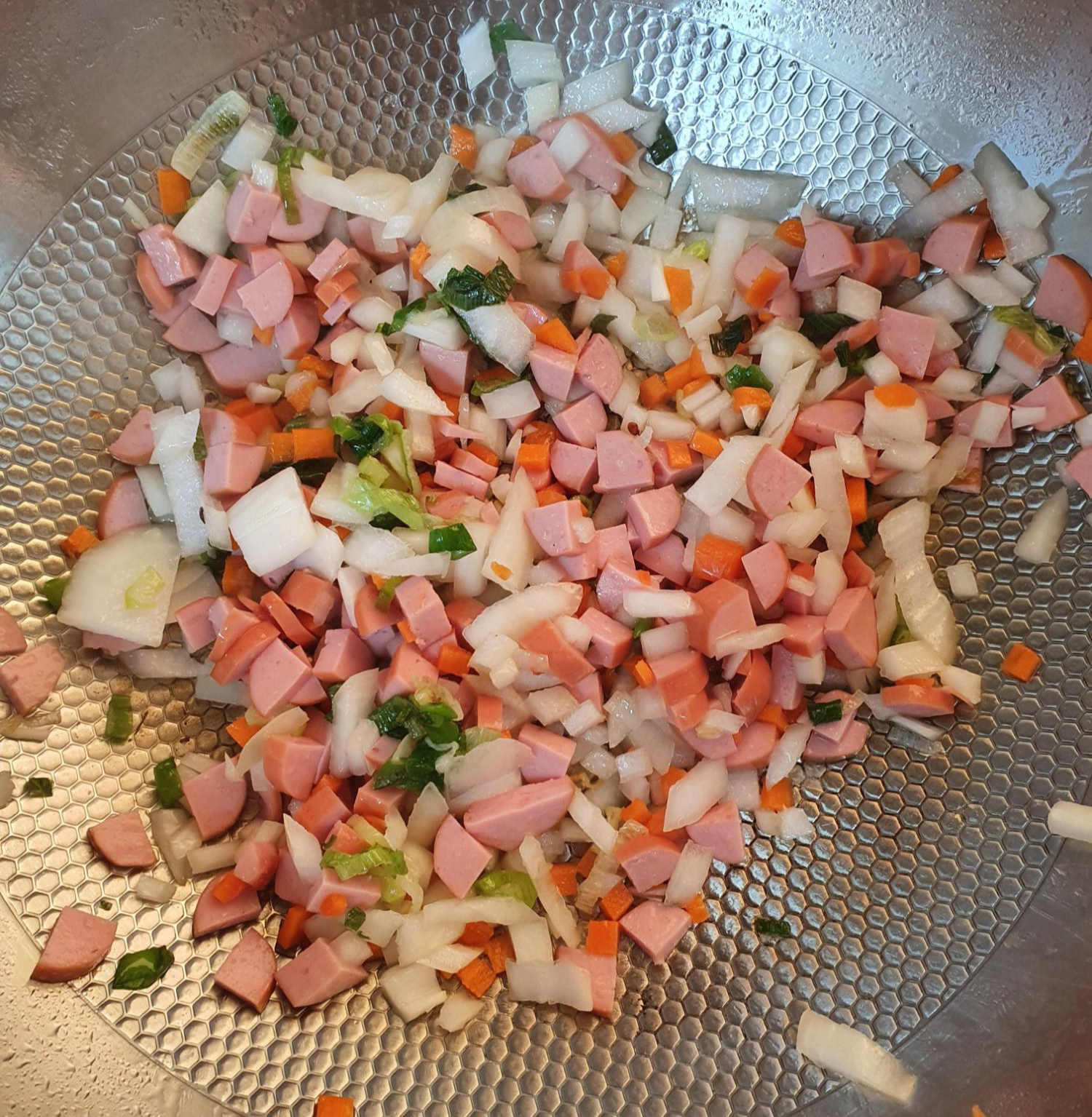 파 기름을 내셨으면 야채 및 소시지 준비한 재료를 한 번에 넣어주세요. 계란은 빼고요. 한 번에 넣어주시고, 야채들이 익는 속도 및 소시지가 익어가는 속도를 잘 관찰해 주세요.