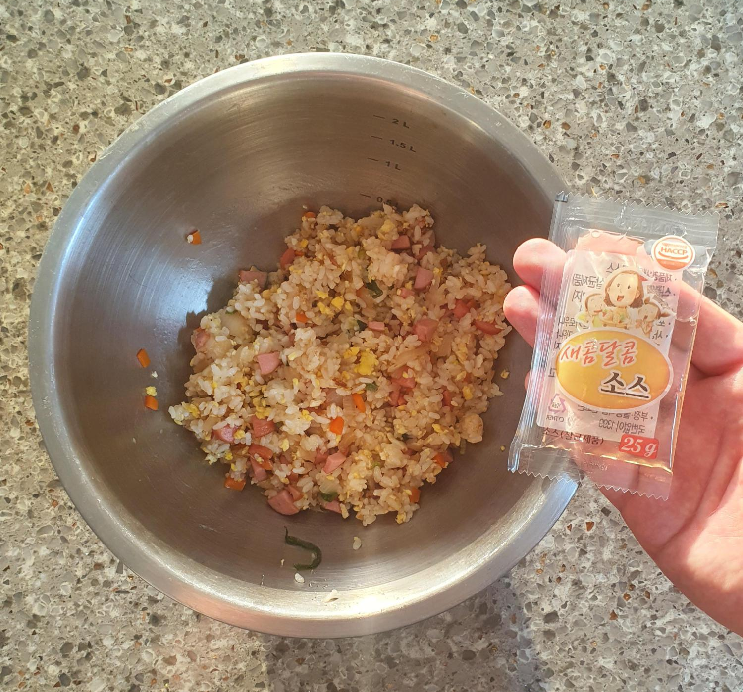 볶음밥이 완성되면 볶음밥을 볼에 옮겨 담아 주세요. 이유는 유부초밥세트를 구매할 때 같이 들어있는 소스를 잘 섞어주기 위해서입니다. 소스를 뿌리게 되면 볶음밥에 윤기가 좌르르 흐르면서 초의 향이 입혀질 것입니다. ^^