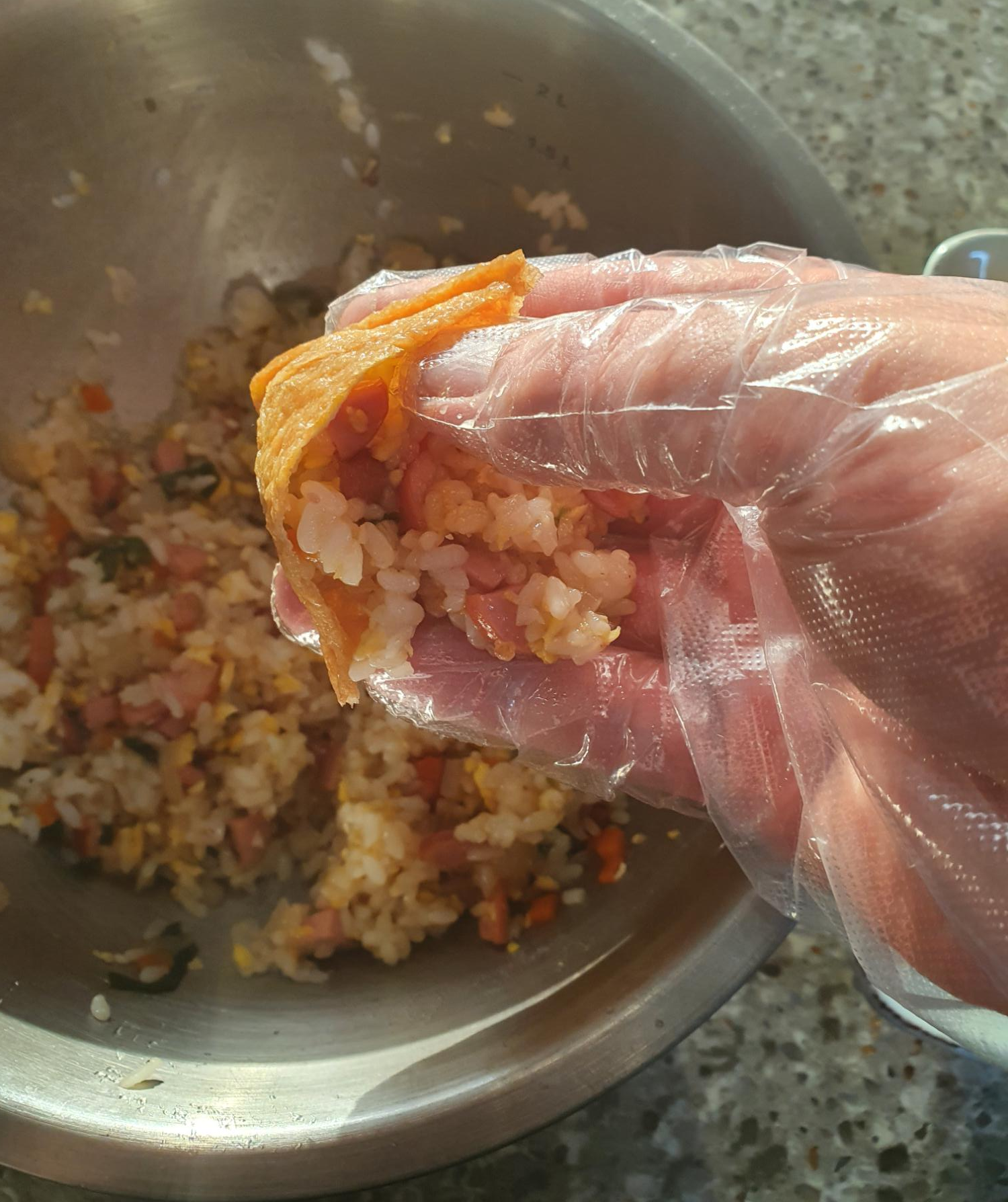 전 유부에 속재료를 넣을 때는 2차로 나누어 넣습니다. 1차에는 속재료가 꼭짓점까지 들어갈 수 있게, 2차에는 나머지 부분을 채우는 형식으로 유부초밥을 만들어요.