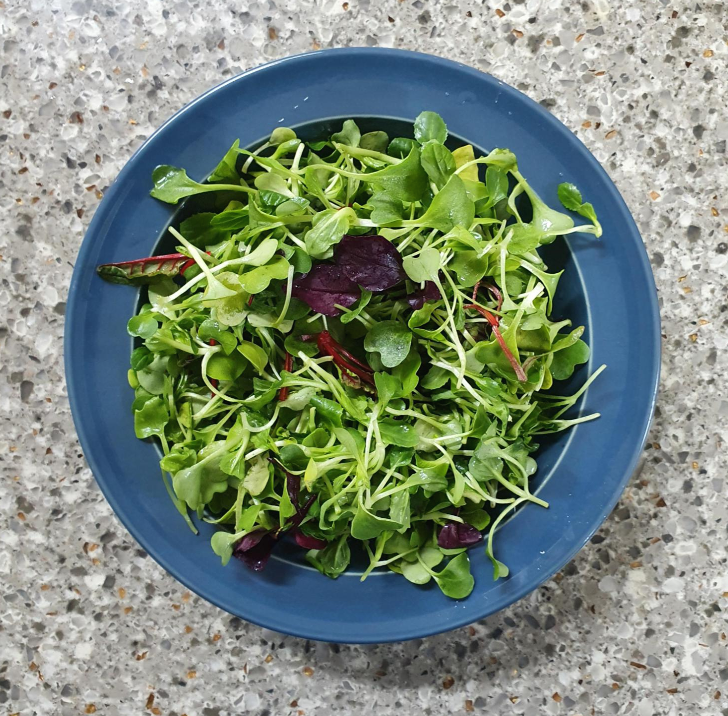 | 재료 준비 새싹채소 1 줌 / 방울토마토 4알 이상 소스 준비 발사믹 2스푼 / 올리브오일 2스푼 / 올리고당 1스푼 / 소금 및 후추 2꼬집씩 |