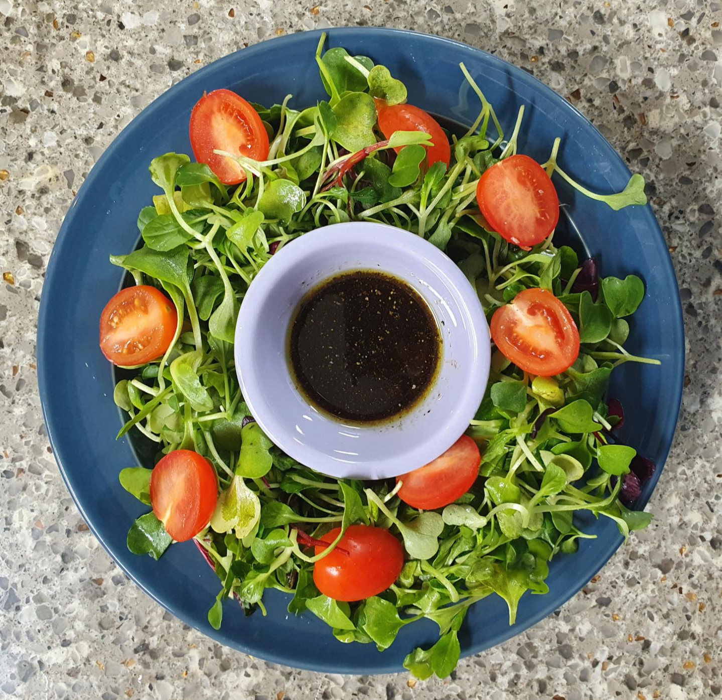 재료 준비 새싹채소 1 줌 / 방울토마토 4알 이상 소스 준비 발사믹 2스푼 / 올리브오일 2스푼 / 올리고당 1스푼 / 소금 및 후추 2꼬집씩 |