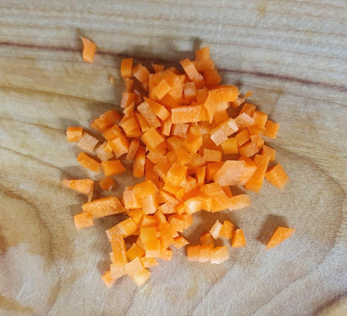 비교적 딱딱한 느낌의 당근도 아주 작게 채 썰어 놓고 준비해 주시면 좋겠네요. 이유는 잘 익을 수 있도록 하기 위함이고, 주황색 빛을 이쁘게 담아내기 위함입니다.