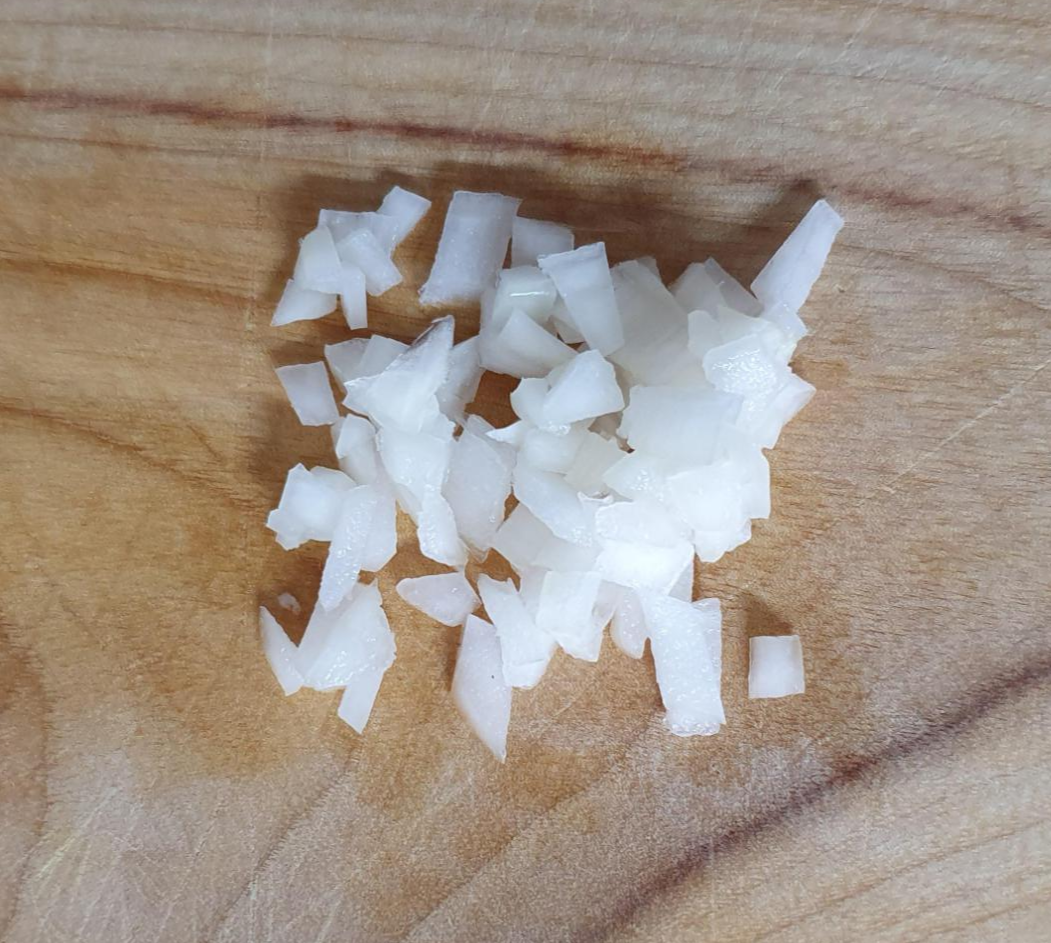 아삭한 식감과 단맛을 추가해 주기위한 양파입니다. 양파는 1/8개 정도 사용하세요. 너무 많이 넣으면 부드러운 식감보다 야채의 식감이 더 살아날 수 있어서입니다.