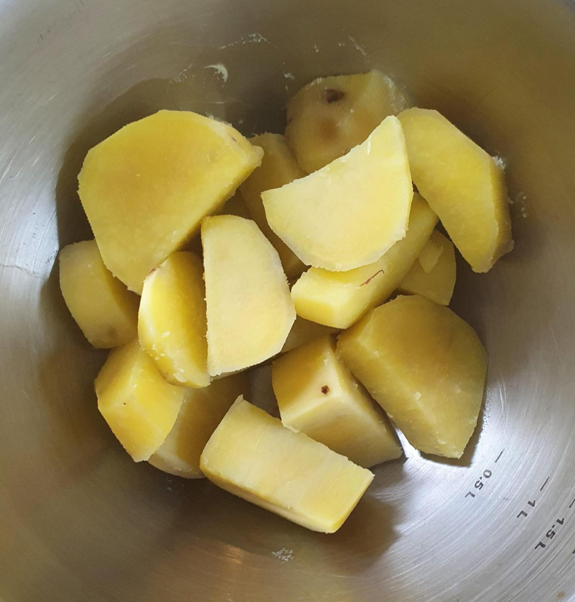 메인 재료인 고구마는 잘 씻어서 껍질을 까 준비해 주세요. 그다음 토막을 내어 삶아줄 것입니다.