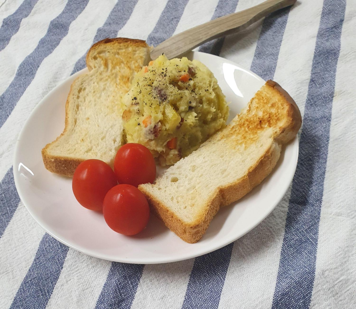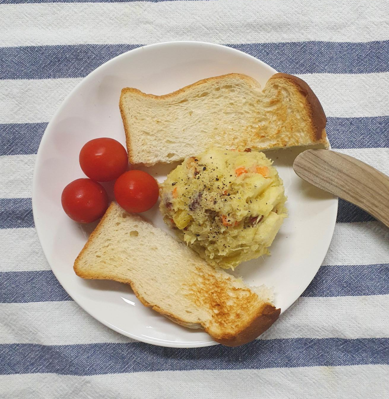 아이가 맛있게 먹을 수 있도록 플레이팅하고~ 플레이팅 할 때 샐러드로 먹어도 맛있지만, 빵과 같이 먹으면 더욱 맛이 좋겠어서 식빵도 같이 준비했네요.
