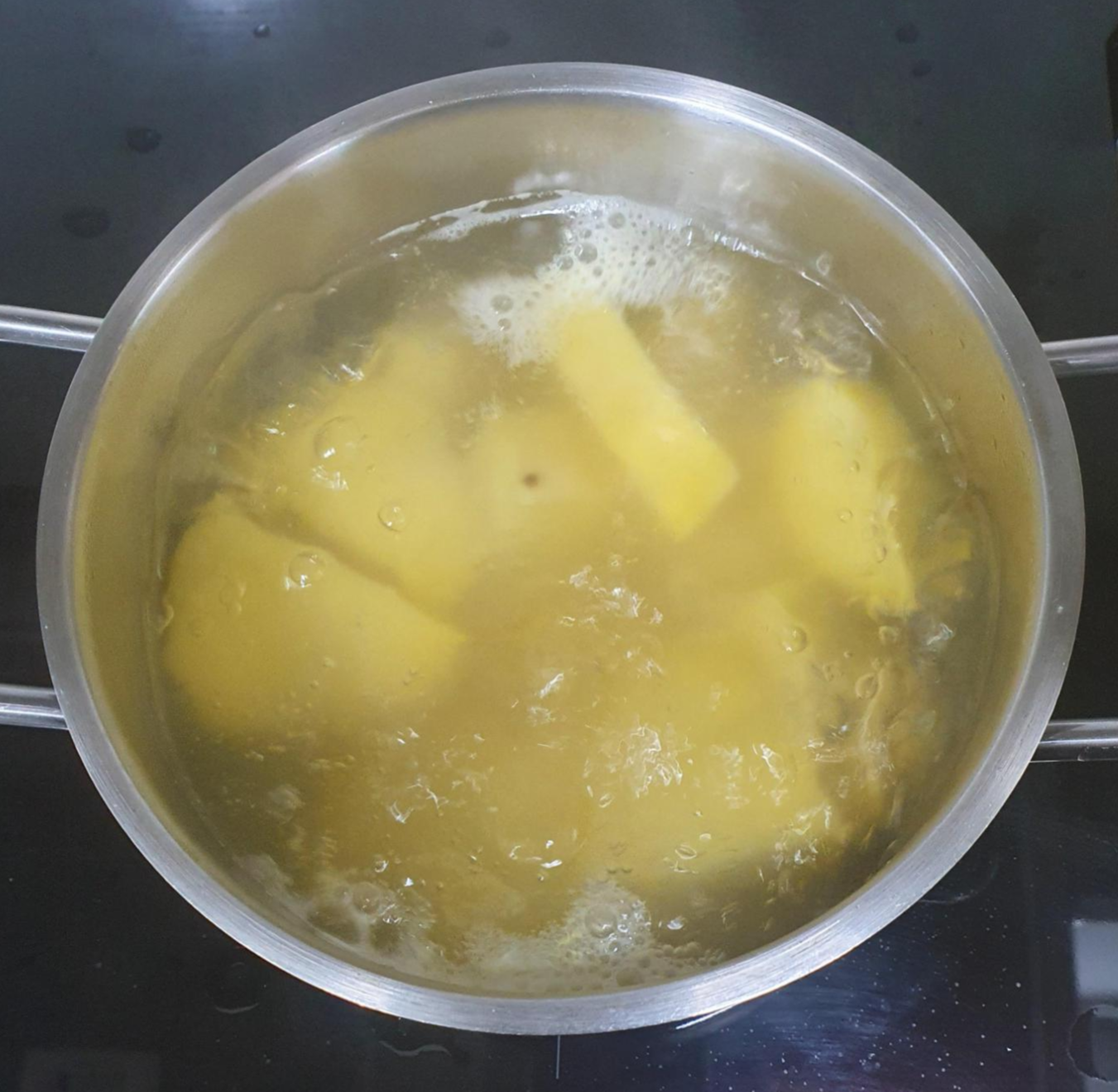 물에는 아무것도 넣지 않고, 고구마만 넣고 삶아 줍니다. 토막을 균일하게 내어 삶아주는것이 고구마가 모두 고르게 익는 것에 도움이 되겠지요?^^