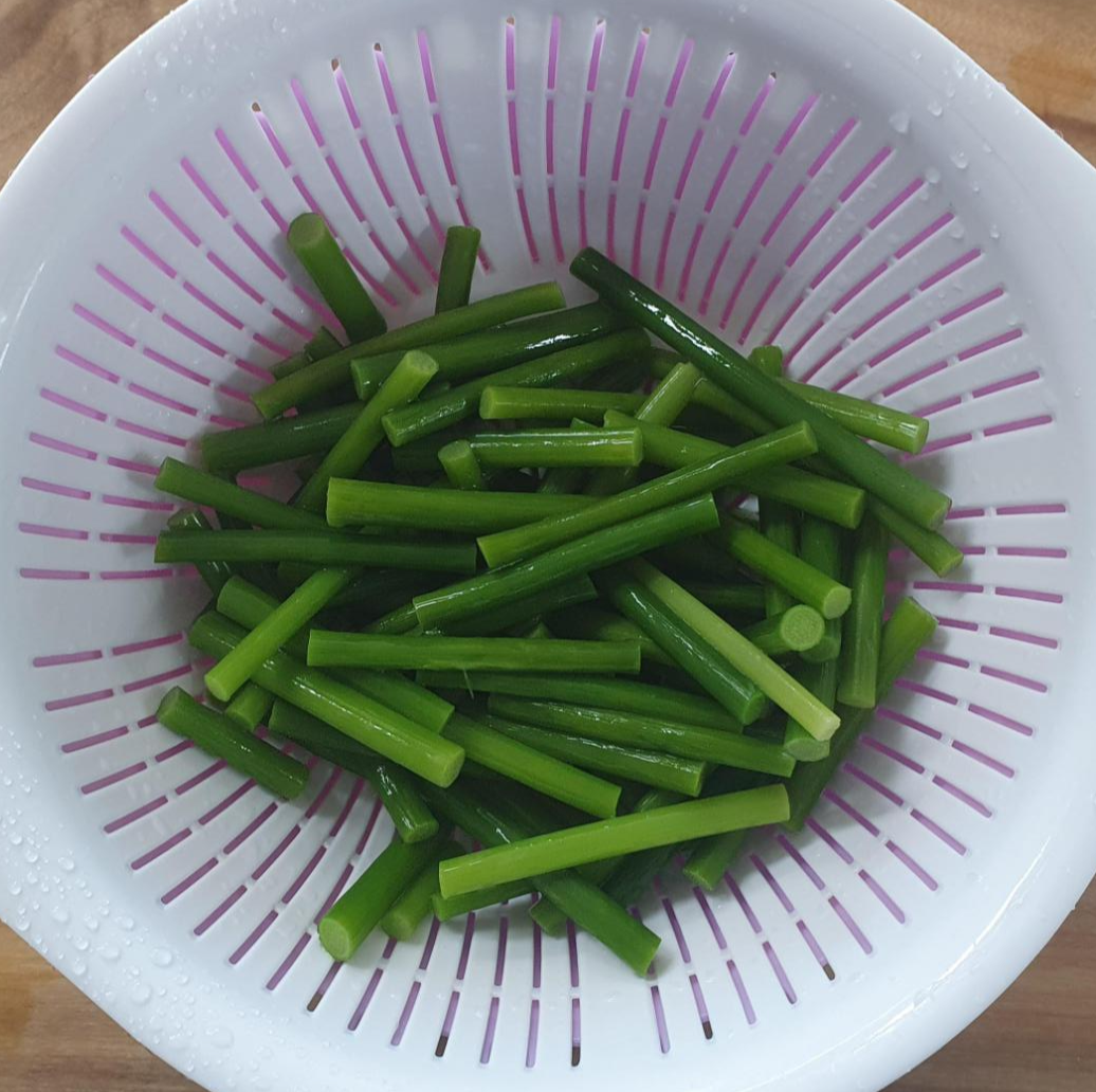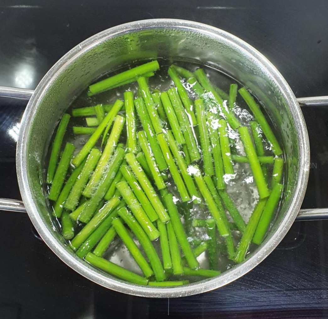 중요한 점은 마늘종은 1분을 기준으로 데쳐야 합니다. 1분 안쪽으로 데치게 되면 아삭아삭한 식감이 굉장히 좋고, 1분 이상을 데치게 되면 아삭한 식감이 조금 덜 하게 돼요. 기호에 맞게 데쳐주시면 좋겠네요~