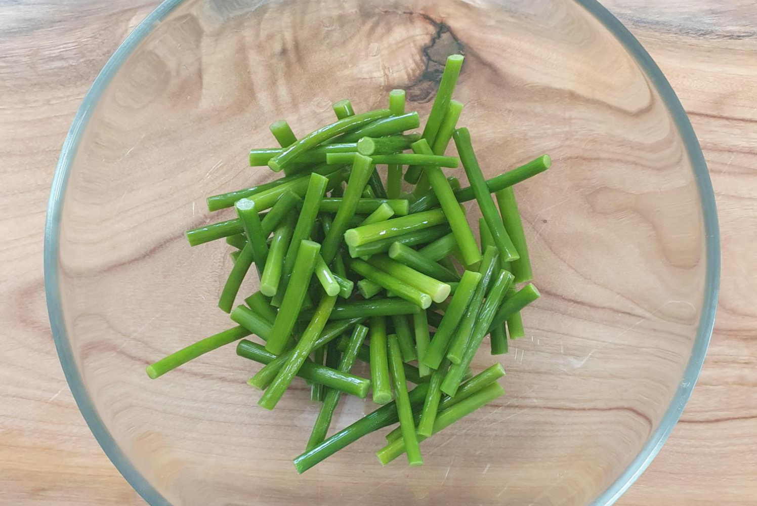 마늘종은 깨끗이 씻은 뒤에 약 5cm 정도 크기로 썰어서 준비해주시면 좋겠습니다. 마늘종 무침 많이 보셨던 그 이미지를 생각하시면서 썰어주시면 좋겠어요~