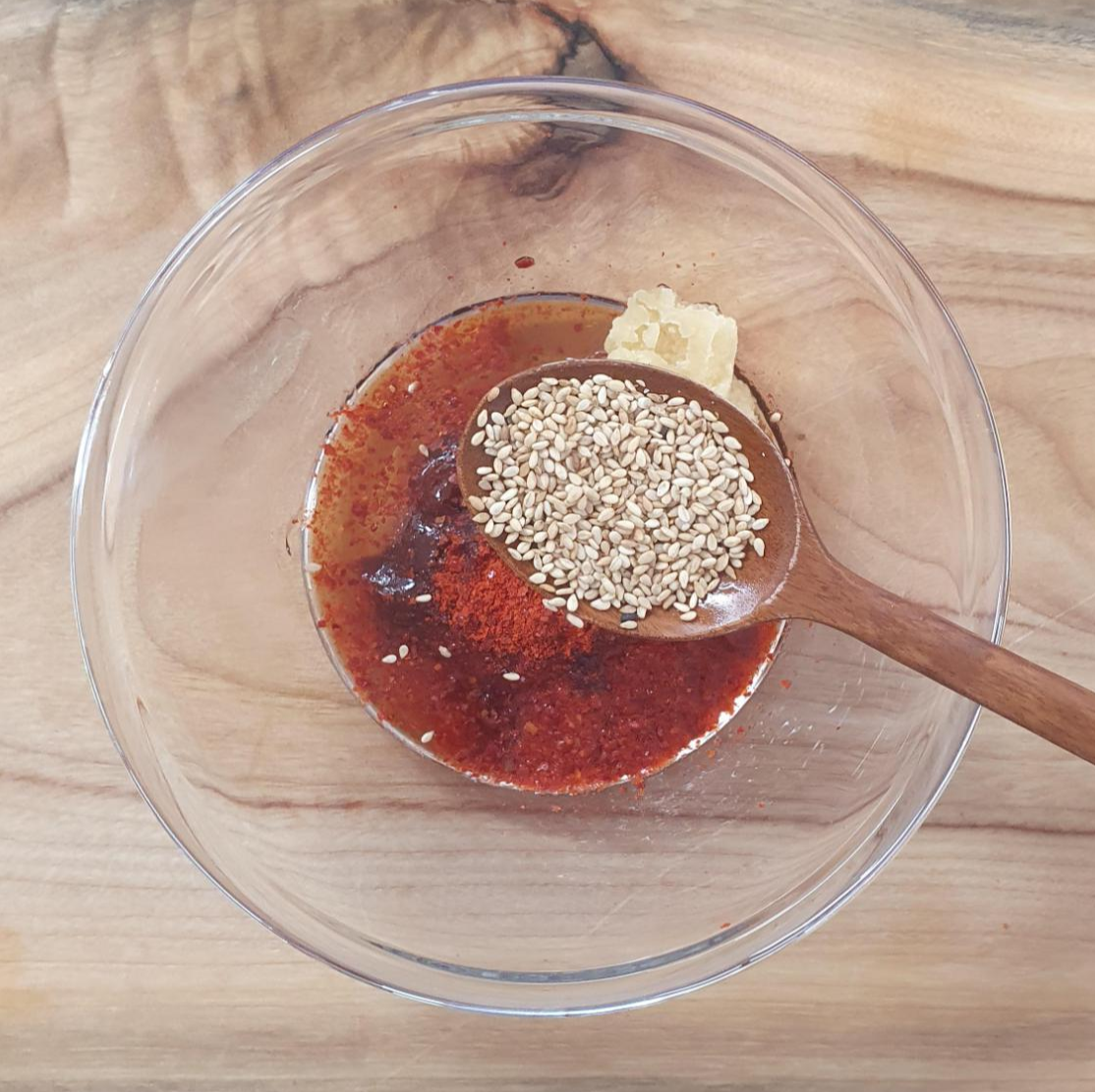 약간의 시큼함과 한국인 반찬에 빠질 수 없는 다진 마늘 1스푼씩을 넣어 마지막 양념을 준비하시고, 잘 섞어 준비합니다.