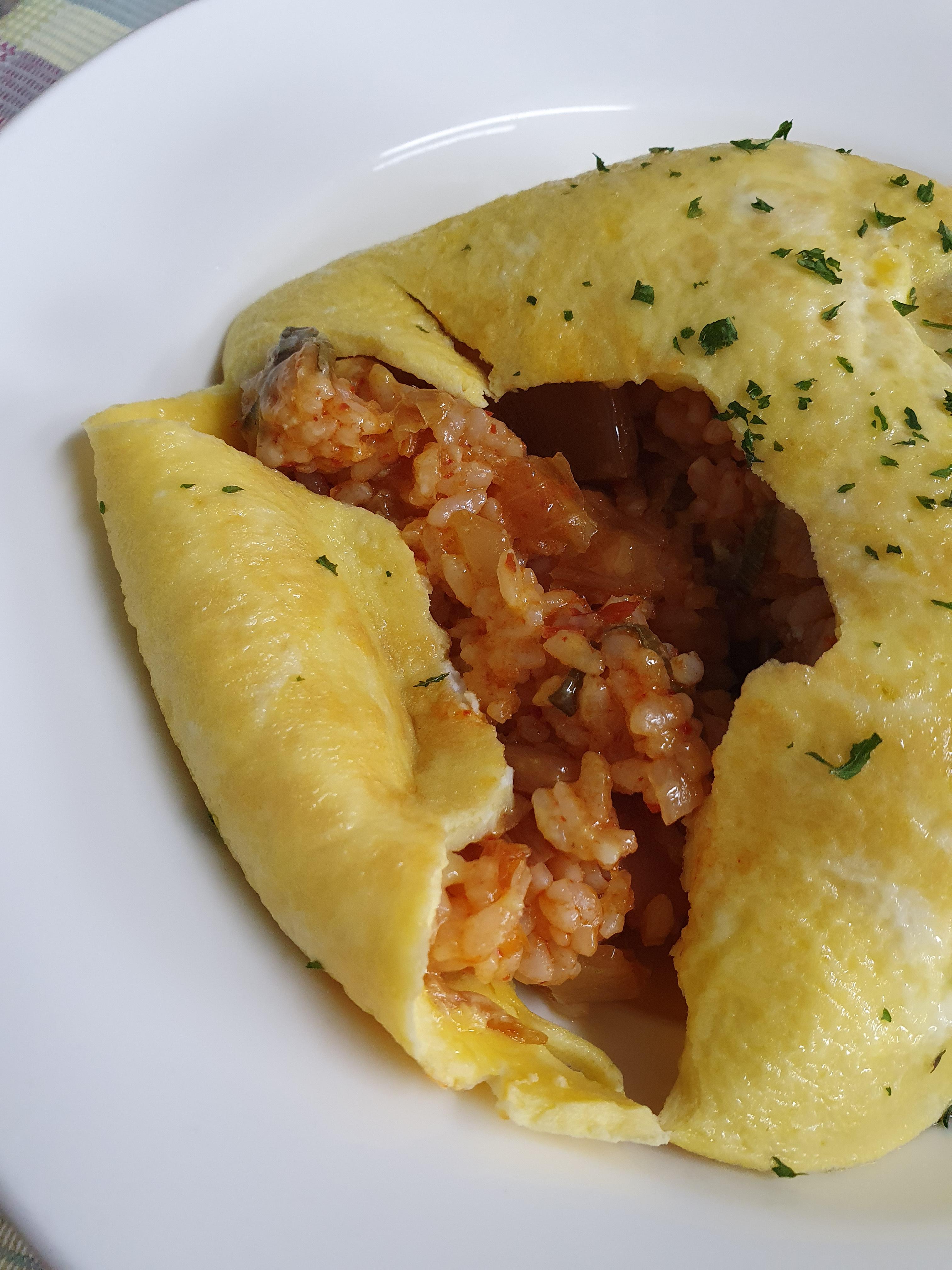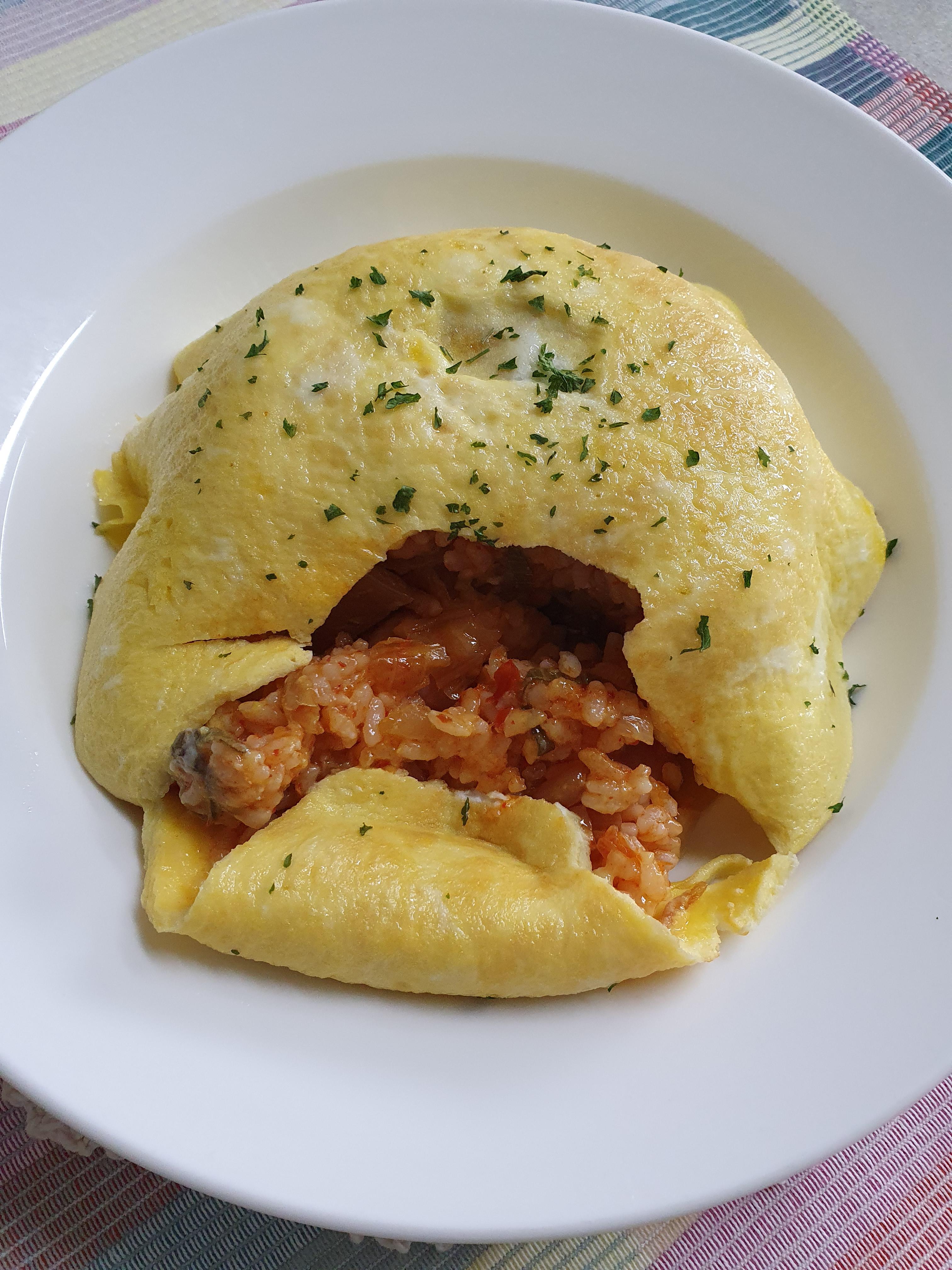 모래성을 쌓아 올리듯 김치볶음밥이 계란 안에 쏙 들어가 있네요~^^