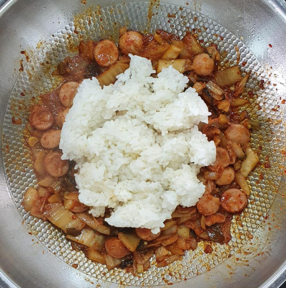 어느 정도 수분이 날아가면서 김치가 맛있게 익어가고, 양념이 잘 베어 들었다면 밥을 넣어 볶아주기 시작하면 됩니다.